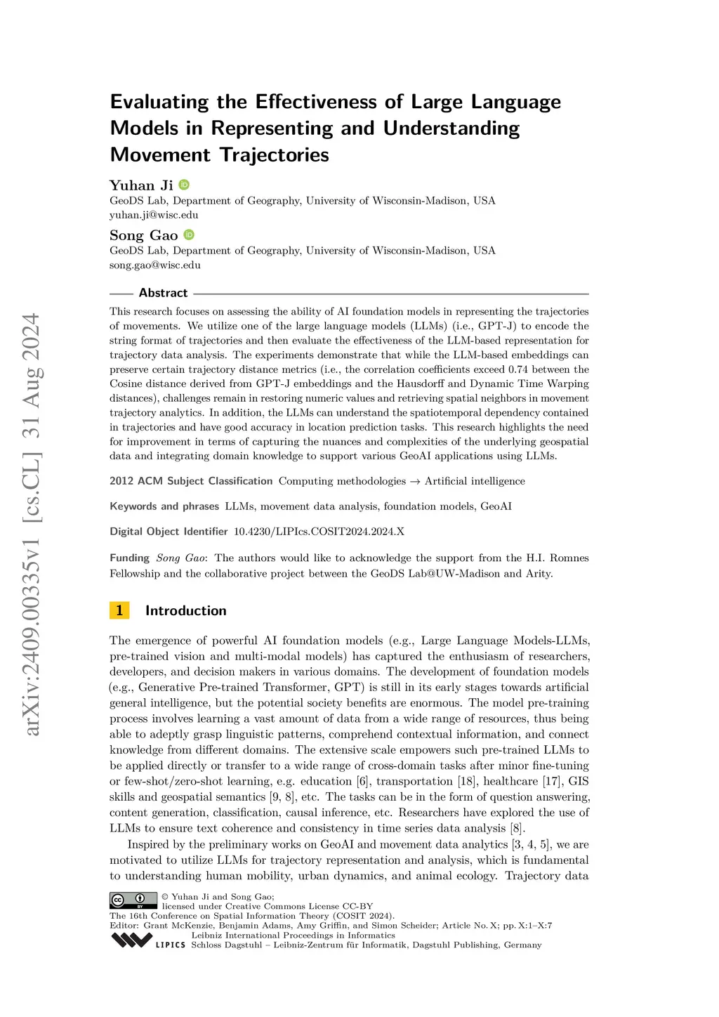 This research focuses on assessing the ability of AI foundation models in representing the trajectories of movements. We utilize one of the large language models (LLMs) (i.e., GPT-J) to encode the string format of trajectories and then evaluate the effectiveness of the LLM-based representation for trajectory data analysis. The experiments demonstrate that while the LLM-based embeddings can preserve certain trajectory distance metrics (i.e., the correlation coefficients exceed 0.74 between the Cosine distance derived from GPT-J embeddings and the Hausdorff and Dynamic Time Warping distances on raw trajectories), challenges remain in restoring numeric values and retrieving spatial neighbors in movement trajectory analytics. In addition, the LLMs can understand the spatiotemporal dependency contained in trajectories and have good accuracy in location prediction tasks. This research highlights the need for improvement in terms of capturing the nuances and complexities of the underlying geospatial data and integrating domain knowledge to support various GeoAI applications using LLMs.