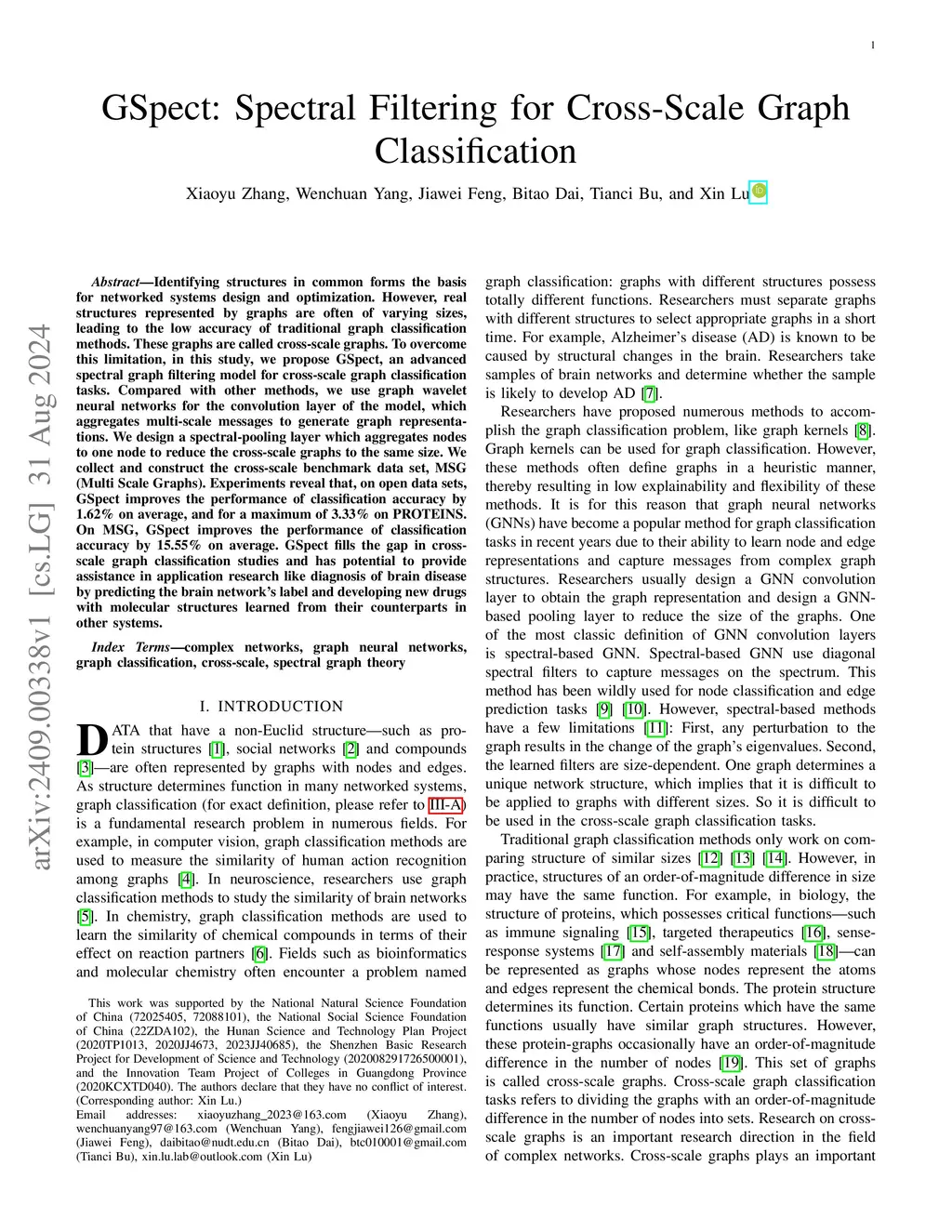 Identifying structures in common forms the basis for networked systems design and optimization. However, real structures represented by graphs are often of varying sizes, leading to the low accuracy of traditional graph classification methods. These graphs are called cross-scale graphs. To overcome this limitation, in this study, we propose GSpect, an advanced spectral graph filtering model for cross-scale graph classification tasks. Compared with other methods, we use graph wavelet neural networks for the convolution layer of the model, which aggregates multi-scale messages to generate graph representations. We design a spectral-pooling layer which aggregates nodes to one node to reduce the cross-scale graphs to the same size. We collect and construct the cross-scale benchmark data set, MSG (Multi Scale Graphs). Experiments reveal that, on open data sets, GSpect improves the performance of classification accuracy by 1.62% on average, and for a maximum of 3.33% on PROTEINS. On MSG, GSpect improves the performance of classification accuracy by 15.55% on average. GSpect fills the gap in cross-scale graph classification studies and has potential to provide assistance in application research like diagnosis of brain disease by predicting the brain network's label and developing new drugs with molecular structures learned from their counterparts in other systems.