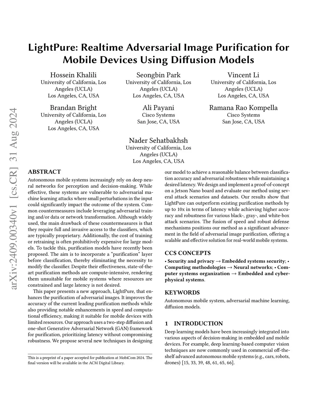 Autonomous mobile systems increasingly rely on deep neural networks for perception and decision-making. While effective, these systems are vulnerable to adversarial machine learning attacks where minor input perturbations can significantly impact outcomes. Common countermeasures involve adversarial training and/or data or network transformation. These methods, though effective, require full access to typically proprietary classifiers and are costly for large models. Recent solutions propose purification models, which add a "purification" layer before classification, eliminating the need to modify the classifier directly. Despite their effectiveness, these methods are compute-intensive, making them unsuitable for mobile systems where resources are limited and low latency is essential. This paper introduces LightPure, a new method that enhances adversarial image purification. It improves the accuracy of existing purification methods and provides notable enhancements in speed and computational efficiency, making it suitable for mobile devices with limited resources. Our approach uses a two-step diffusion and one-shot Generative Adversarial Network (GAN) framework, prioritizing latency without compromising robustness. We propose several new techniques to achieve a reasonable balance between classification accuracy and adversarial robustness while maintaining desired latency. We design and implement a proof-of-concept on a Jetson Nano board and evaluate our method using various attack scenarios and datasets. Our results show that LightPure can outperform existing methods by up to 10x in terms of latency while achieving higher accuracy and robustness for various attack scenarios. This method offers a scalable and effective solution for real-world mobile systems.