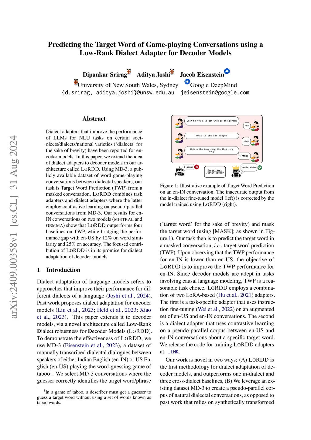 Predicting the Target Word of Game-playing Conversations using a Low-Rank Dialect Adapter for Decoder Models