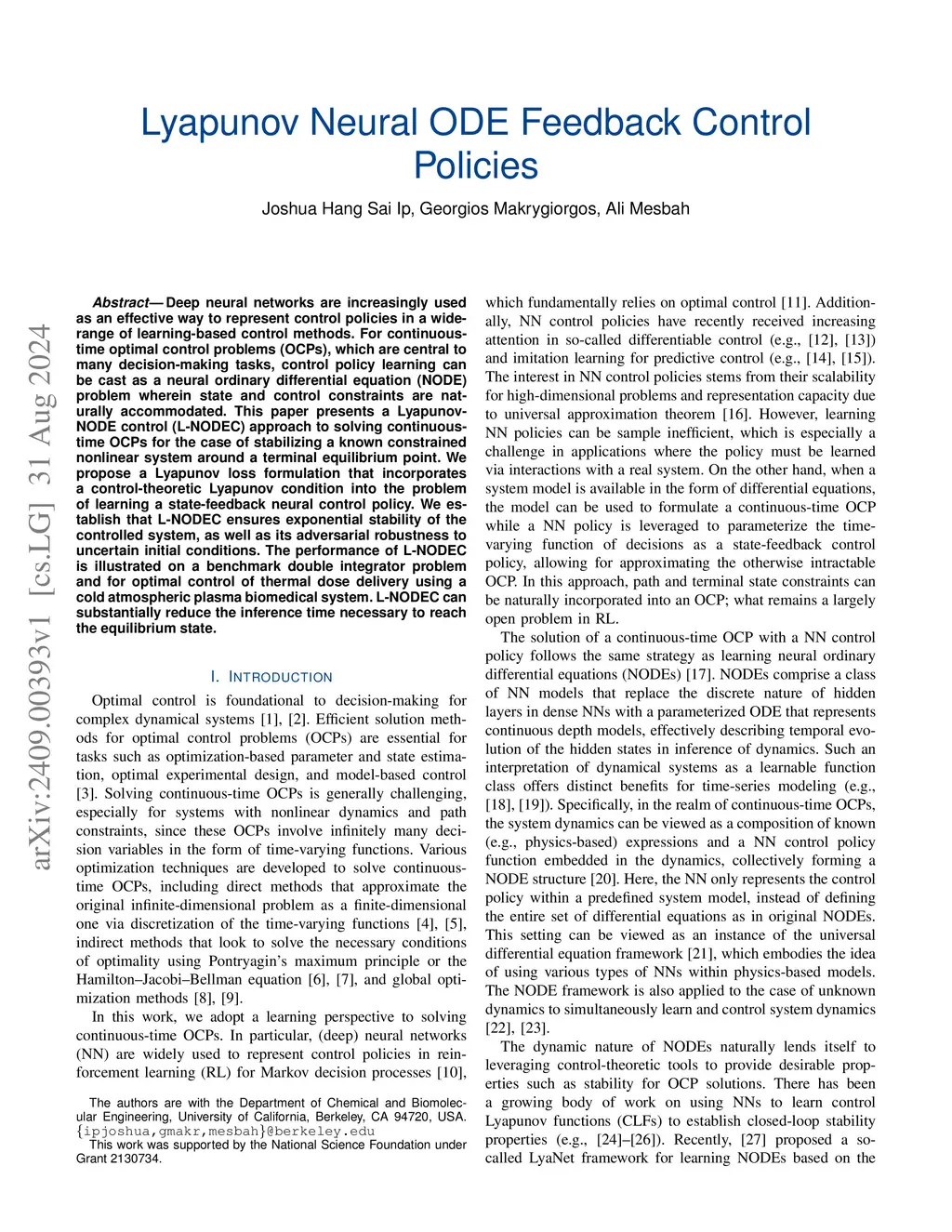 Lyapunov Neural ODE State-Feedback Control Policies