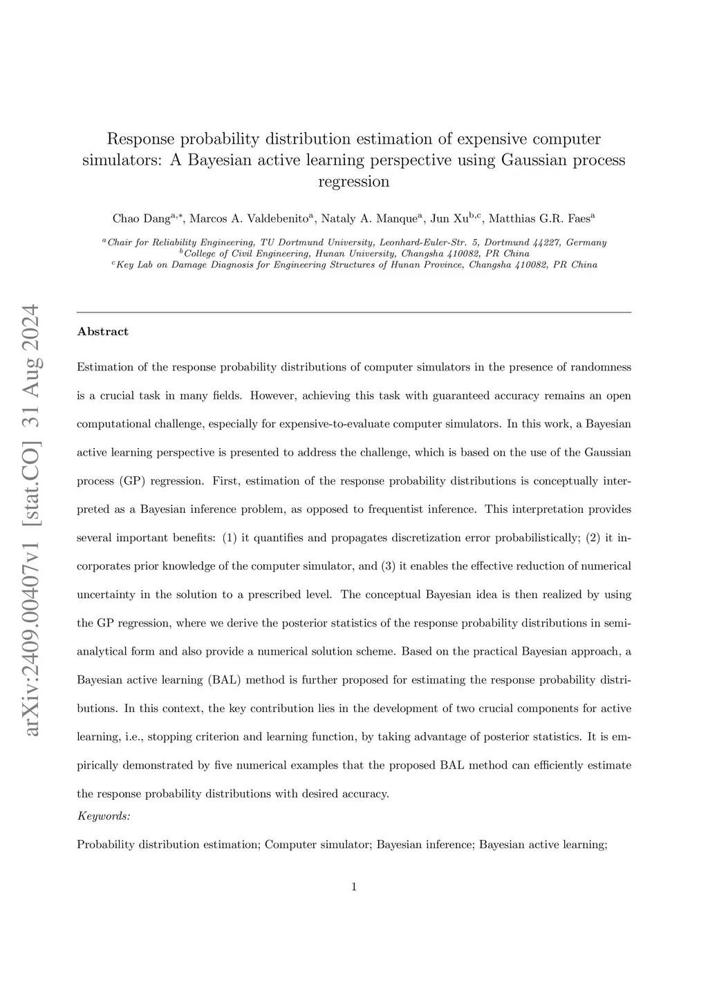 Estimation of the response probability distributions of computer simulators in the presence of randomness is a crucial task in many fields. However, achieving this task with guaranteed accuracy remains an open computational challenge, especially for expensive-to-evaluate computer simulators. In this work, a Bayesian active learning perspective is presented to address the challenge, which is based on the use of the Gaussian process (GP) regression. First, estimation of the response probability distributions is conceptually interpreted as a Bayesian inference problem, as opposed to frequentist inference. This interpretation provides several important benefits: (1) it quantifies and propagates discretization error probabilistically; (2) it incorporates prior knowledge of the computer simulator, and (3) it enables the effective reduction of numerical uncertainty in the solution to a prescribed level. The conceptual Bayesian idea is then realized by using the GP regression, where we derive the posterior statistics of the response probability distributions in semi-analytical form and also provide a numerical solution scheme. Based on the practical Bayesian approach, a Bayesian active learning (BAL) method is further proposed for estimating the response probability distributions. In this context, the key contribution lies in the development of two crucial components for active learning, i.e., stopping criterion and learning function, by taking advantage of posterior statistics. It is empirically demonstrated by five numerical examples that the proposed BAL method can efficiently estimate the response probability distributions with desired accuracy.