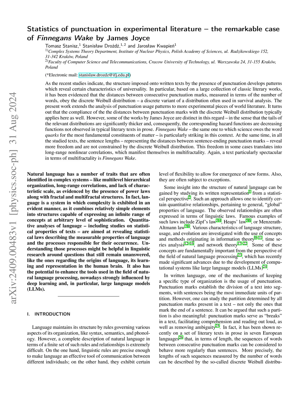 As the recent studies indicate, the structure imposed onto written texts by the presence of punctuation develops patterns which reveal certain characteristics of universality. In particular, based on a large collection of classic literary works, it has been evidenced that the distances between consecutive punctuation marks, measured in terms of the number of words, obey the discrete Weibull distribution - a discrete variant of a distribution often used in survival analysis. The present work extends the analysis of punctuation usage patterns to more experimental pieces of world literature. It turns out that the compliance of the the distances between punctuation marks with the discrete Weibull distribution typically applies here as well. However, some of the works by James Joyce are distinct in this regard - in the sense that the tails of the relevant distributions are significantly thicker and, consequently, the corresponding hazard functions are decreasing functions not observed in typical literary texts in prose. "Finnegans Wake" - the same one to which science owes the word "quarks" for the most fundamental constituents of matter - is particularly striking in this context. At the same time, in all the studied texts, the sentence lengths - representing the distances between sentence-ending punctuation marks - reveal more freedom and are not constrained by the discrete Weibull distribution. This freedom in some cases translates into long-range nonlinear correlations, which manifest themselves in multifractality. Again, a text particularly spectacular in terms of multifractality is "Finnegans Wake".