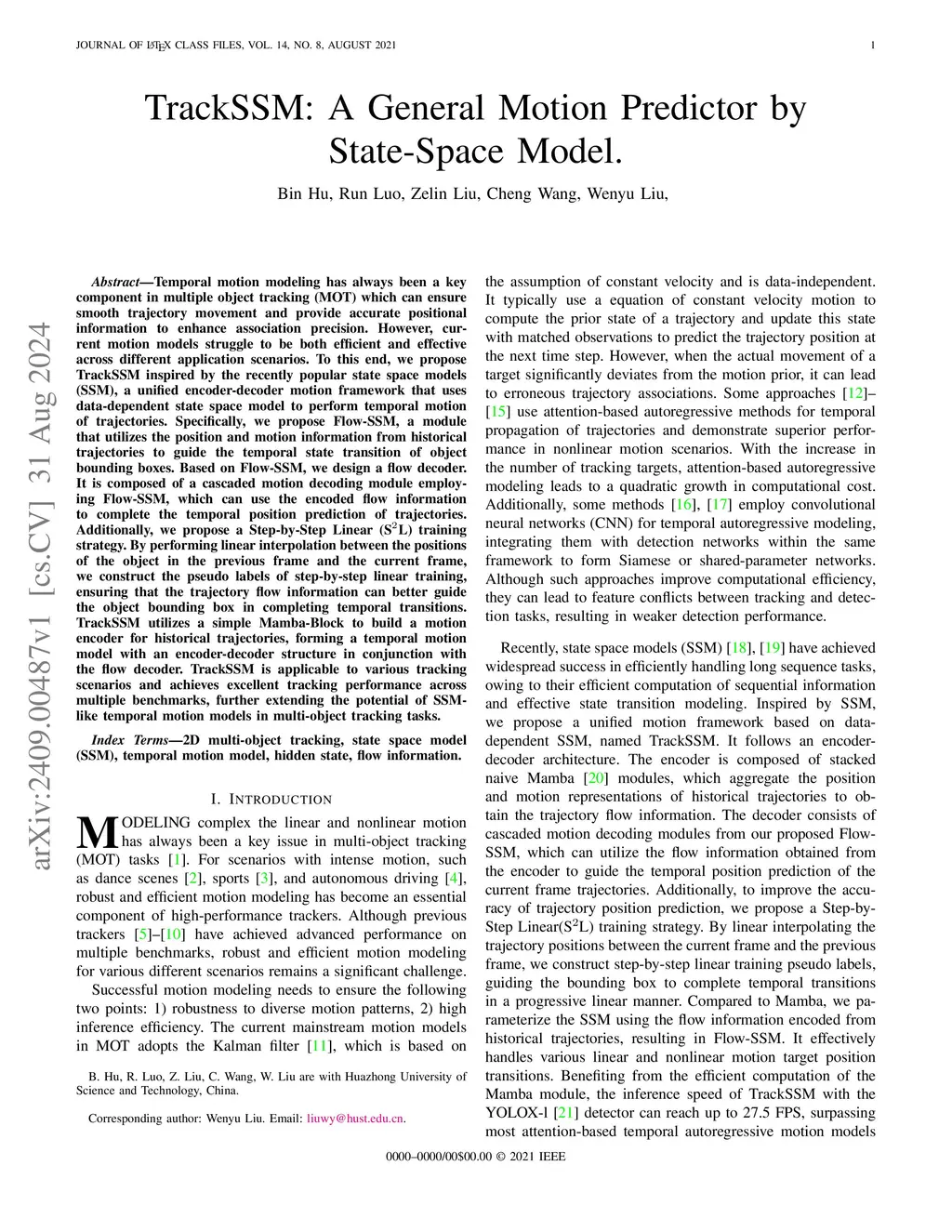 Temporal motion modeling has always been a key component in multiple object tracking (MOT) which can ensure smooth trajectory movement and provide accurate positional information to enhance association precision. However, current motion models struggle to be both efficient and effective across different application scenarios. To this end, we propose TrackSSM inspired by the recently popular state space models (SSM), a unified encoder-decoder motion framework that uses data-dependent state space model to perform temporal motion of trajectories. Specifically, we propose Flow-SSM, a module that utilizes the position and motion information from historical trajectories to guide the temporal state transition of object bounding boxes. Based on Flow-SSM, we design a flow decoder. It is composed of a cascaded motion decoding module employing Flow-SSM, which can use the encoded flow information to complete the temporal position prediction of trajectories. Additionally, we propose a Step-by-Step Linear (SL) training strategy. By performing linear interpolation between the positions of the object in the previous frame and the current frame, we construct the pseudo labels of step-by-step linear training, ensuring that the trajectory flow information can better guide the object bounding box in completing temporal transitions. TrackSSM utilizes a simple Mamba-Block to build a motion encoder for historical trajectories, forming a temporal motion model with an encoder-decoder structure in conjunction with the flow decoder. TrackSSM is applicable to various tracking scenarios and achieves excellent tracking performance across multiple benchmarks, further extending the potential of SSM-like temporal motion models in multi-object tracking tasks. Code and models are publicly available at \url{https://github.com/Xavier-Lin/TrackSSM}.