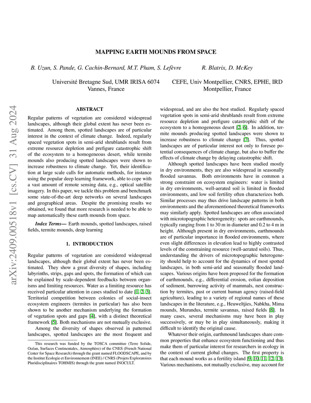 Regular patterns of vegetation are considered widespread landscapes, although their global extent has never been estimated. Among them, spotted landscapes are of particular interest in the context of climate change. Indeed, regularly spaced vegetation spots in semi-arid shrublands result from extreme resource depletion and prefigure catastrophic shift of the ecosystem to a homogeneous desert, while termite mounds also producing spotted landscapes were shown to increase robustness to climate change. Yet, their identification at large scale calls for automatic methods, for instance using the popular deep learning framework, able to cope with a vast amount of remote sensing data, e.g., optical satellite imagery. In this paper, we tackle this problem and benchmark some state-of-the-art deep networks on several landscapes and geographical areas. Despite the promising results we obtained, we found that more research is needed to be able to map automatically these earth mounds from space.
