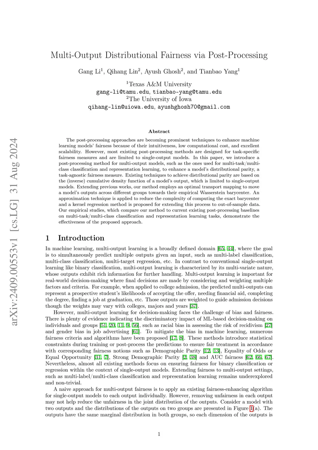 The post-processing approaches are becoming prominent techniques to enhance machine learning models' fairness because of their intuitiveness, low computational cost, and excellent scalability. However, most existing post-processing methods are designed for task-specific fairness measures and are limited to single-output models. In this paper, we introduce a post-processing method for multi-output models, such as the ones used for multi-task/multi-class classification and representation learning, to enhance a model's distributional parity, a task-agnostic fairness measure. Existing methods for achieving distributional parity rely on the (inverse) cumulative density function of a model's output, restricting their applicability to single-output models. Extending previous works, we propose to employ optimal transport mappings to move a model's outputs across different groups towards their empirical Wasserstein barycenter. An approximation technique is applied to reduce the complexity of computing the exact barycenter and a kernel regression method is proposed to extend this process to out-of-sample data. Our empirical studies evaluate the proposed approach against various baselines on multi-task/multi-class classification and representation learning tasks, demonstrating the effectiveness of the proposed approach.