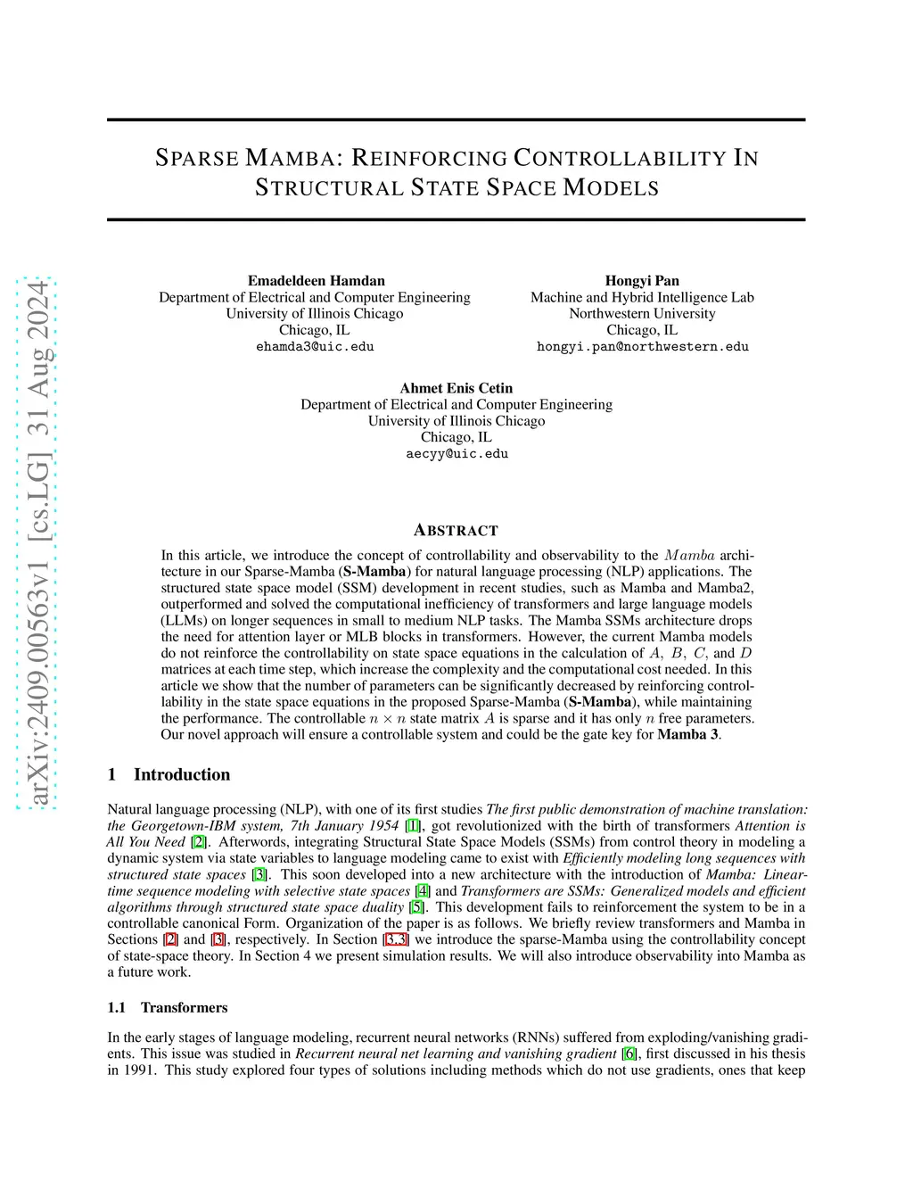 In this work, we introduce the concept of controllability and observability to the Mamba SSM's architecture in our Sparse-Mamba (S-Mamba) for natural language processing (NLP) applications. The structured state space model (SSM) development in recent studies, such as Mamba and Mamba2, outperformed and solved the computational inefficiency of transformers and large language models at small to medium scale. The Mamba SSMs architecture drops the need for attention layers or multilayer perception blocks in transformers. However, current Mamba models lack reinforcement of controllability in state-space equations for computing the , , , and matrices at each time step, leading to increased complexity and computational costs. In this paper, we demonstrate a reduction of parameters in comparison to the first published Mamba and Mamba2. We showcase an improvement in perplexity by 5\% and a decrease in training time by 3\% after reinforcing controllability and observability on the original Mamba architecture in our proposed S-Mamba. The controllable state matrix is sparse and it has only free parameters. Our novel approach will ensure a controllable system which will be the gate key for Mamba3.