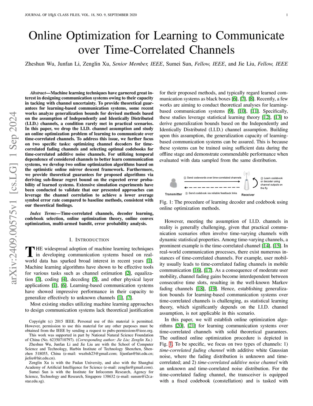 Machine learning techniques have garnered great interest in designing communication systems owing to their capacity in tackling with channel uncertainty. To provide theoretical guarantees for learning-based communication systems, some recent works analyze generalization bounds for devised methods based on the assumption of Independently and Identically Distributed (I.I.D.) channels, a condition rarely met in practical scenarios. In this paper, we drop the I.I.D. channel assumption and study an online optimization problem of learning to communicate over time-correlated channels. To address this issue, we further focus on two specific tasks: optimizing channel decoders for time-correlated fading channels and selecting optimal codebooks for time-correlated additive noise channels. For utilizing temporal dependence of considered channels to better learn communication systems, we develop two online optimization algorithms based on the optimistic online mirror descent framework. Furthermore, we provide theoretical guarantees for proposed algorithms via deriving sub-linear regret bound on the expected error probability of learned systems. Extensive simulation experiments have been conducted to validate that our presented approaches can leverage the channel correlation to achieve a lower average symbol error rate compared to baseline methods, consistent with our theoretical findings.