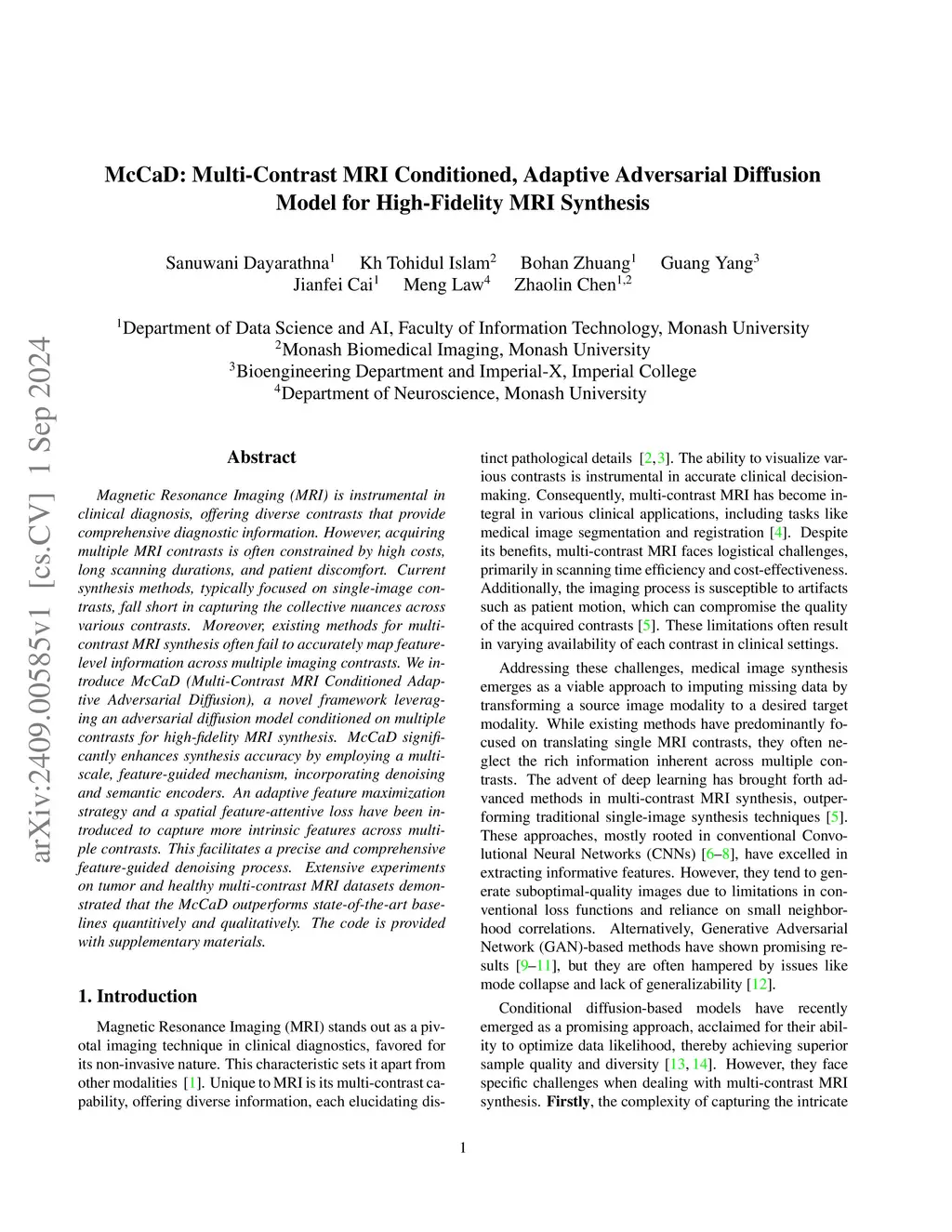 McCaD: Multi-Contrast MRI Conditioned, Adaptive Adversarial Diffusion