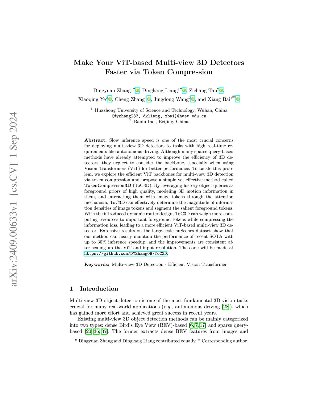 Slow inference speed is one of the most crucial concerns for deploying multi-view 3D detectors to tasks with high real-time requirements like autonomous driving. Although many sparse query-based methods have already attempted to improve the efficiency of 3D detectors, they neglect to consider the backbone, especially when using Vision Transformers (ViT) for better performance. To tackle this problem, we explore the efficient ViT backbones for multi-view 3D detection via token compression and propose a simple yet effective method called TokenCompression3D (ToC3D). By leveraging history object queries as foreground priors of high quality, modeling 3D motion information in them, and interacting them with image tokens through the attention mechanism, ToC3D can effectively determine the magnitude of information densities of image tokens and segment the salient foreground tokens. With the introduced dynamic router design, ToC3D can weigh more computing resources to important foreground tokens while compressing the information loss, leading to a more efficient ViT-based multi-view 3D detector. Extensive results on the large-scale nuScenes dataset show that our method can nearly maintain the performance of recent SOTA with up to 30% inference speedup, and the improvements are consistent after scaling up the ViT and input resolution. The code will be made at https://github.com/DYZhang09/ToC3D.
