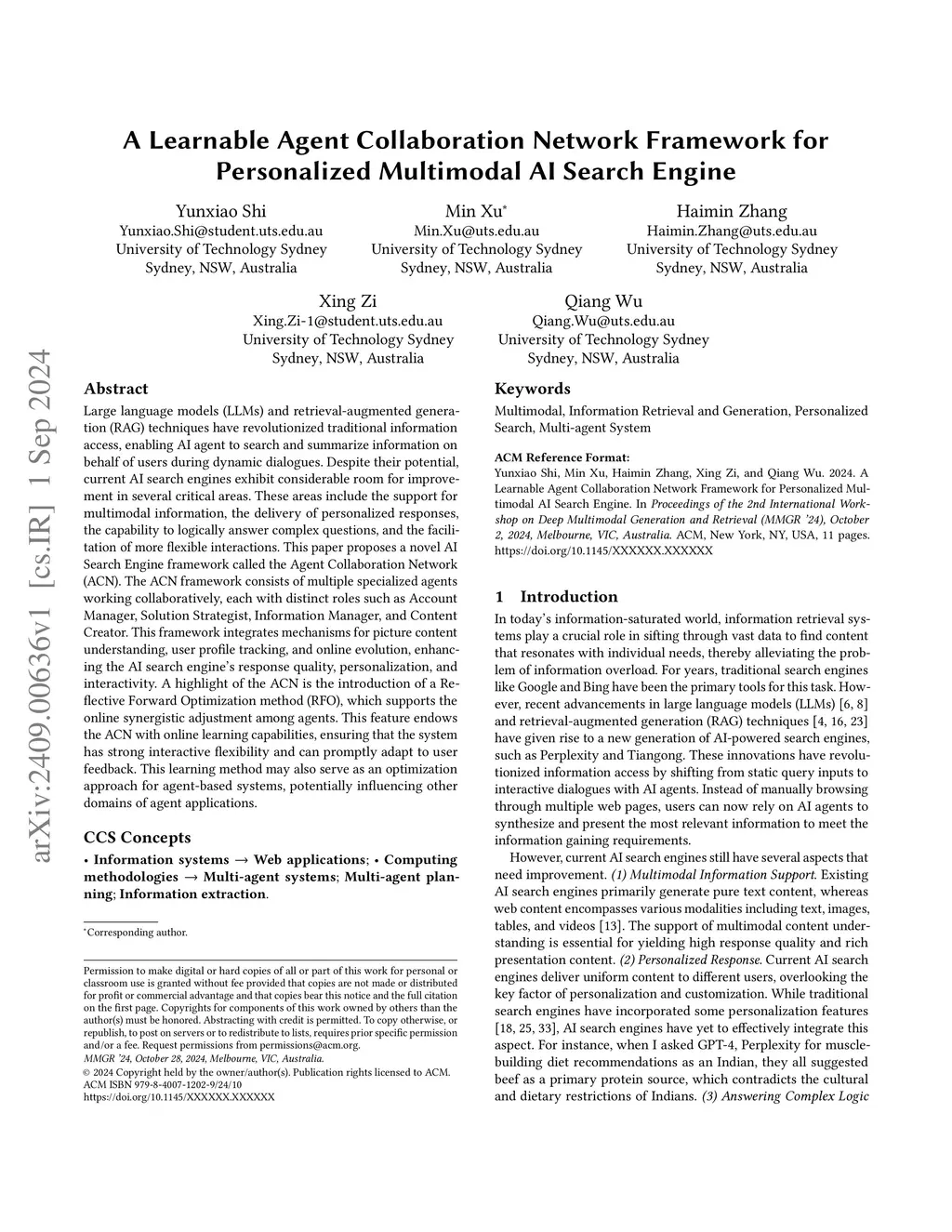 Large language models (LLMs) and retrieval-augmented generation (RAG) techniques have revolutionized traditional information access, enabling AI agent to search and summarize information on behalf of users during dynamic dialogues. Despite their potential, current AI search engines exhibit considerable room for improvement in several critical areas. These areas include the support for multimodal information, the delivery of personalized responses, the capability to logically answer complex questions, and the facilitation of more flexible interactions. This paper proposes a novel AI Search Engine framework called the Agent Collaboration Network (ACN). The ACN framework consists of multiple specialized agents working collaboratively, each with distinct roles such as Account Manager, Solution Strategist, Information Manager, and Content Creator. This framework integrates mechanisms for picture content understanding, user profile tracking, and online evolution, enhancing the AI search engine's response quality, personalization, and interactivity. A highlight of the ACN is the introduction of a Reflective Forward Optimization method (RFO), which supports the online synergistic adjustment among agents. This feature endows the ACN with online learning capabilities, ensuring that the system has strong interactive flexibility and can promptly adapt to user feedback. This learning method may also serve as an optimization approach for agent-based systems, potentially influencing other domains of agent applications.