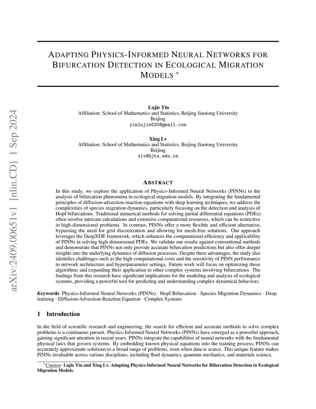 In this study, we explore the application of Physics-Informed Neural Networks (PINNs) to the analysis of bifurcation phenomena in ecological migration models. By integrating the fundamental principles of diffusion-advection-reaction equations with deep learning techniques, we address the complexities of species migration dynamics, particularly focusing on the detection and analysis of Hopf bifurcations. Traditional numerical methods for solving partial differential equations (PDEs) often involve intricate calculations and extensive computational resources, which can be restrictive in high-dimensional problems. In contrast, PINNs offer a more flexible and efficient alternative, bypassing the need for grid discretization and allowing for mesh-free solutions. Our approach leverages the DeepXDE framework, which enhances the computational efficiency and applicability of PINNs in solving high-dimensional PDEs. We validate our results against conventional methods and demonstrate that PINNs not only provide accurate bifurcation predictions but also offer deeper insights into the underlying dynamics of diffusion processes. Despite these advantages, the study also identifies challenges such as the high computational costs and the sensitivity of PINN performance to network architecture and hyperparameter settings. Future work will focus on optimizing these algorithms and expanding their application to other complex systems involving bifurcations. The findings from this research have significant implications for the modeling and analysis of ecological systems, providing a powerful tool for predicting and understanding complex dynamical behaviors.