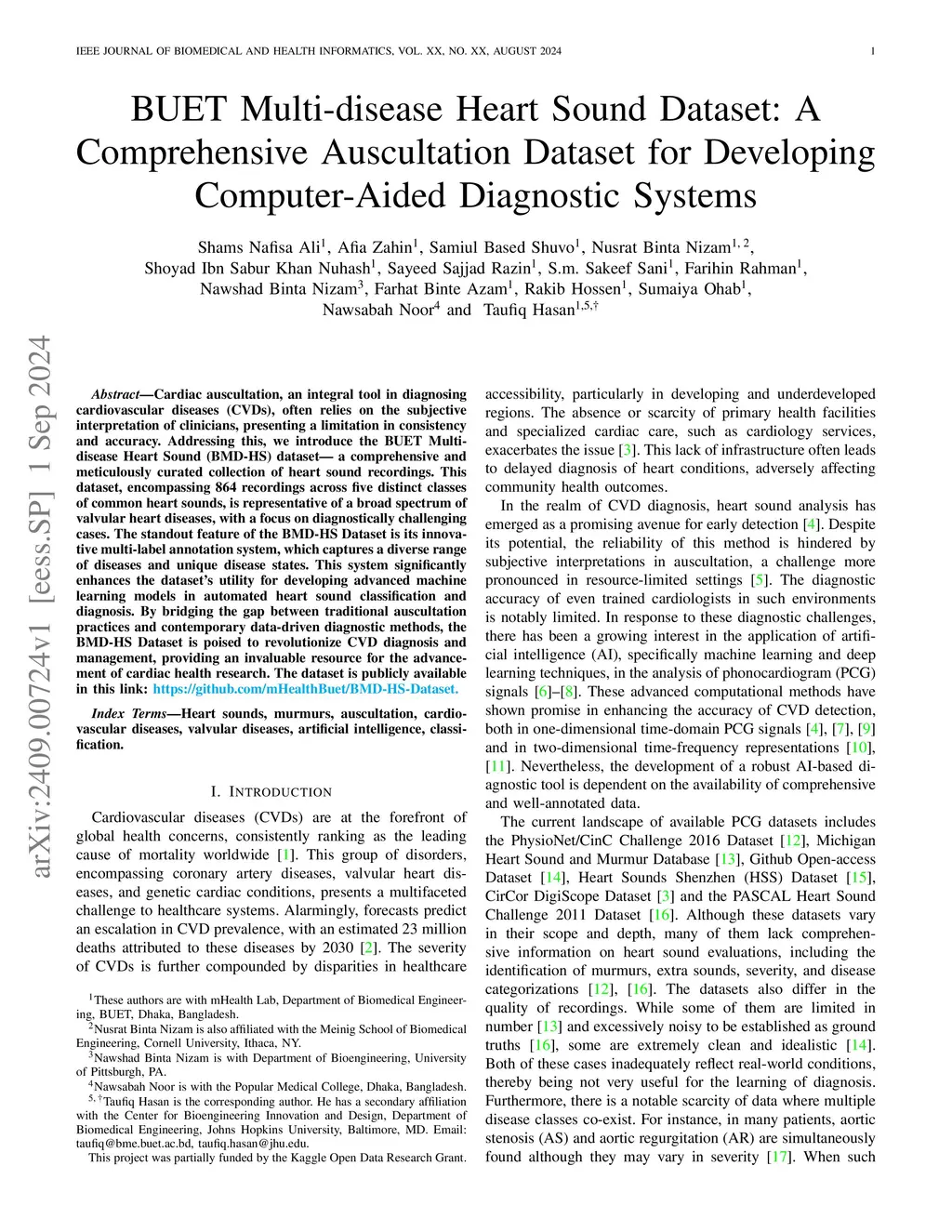 Cardiac auscultation, an integral tool in diagnosing cardiovascular diseases (CVDs), often relies on the subjective interpretation of clinicians, presenting a limitation in consistency and accuracy. Addressing this, we introduce the BUET Multi-disease Heart Sound (BMD-HS) dataset - a comprehensive and meticulously curated collection of heart sound recordings. This dataset, encompassing 864 recordings across five distinct classes of common heart sounds, represents a broad spectrum of valvular heart diseases, with a focus on diagnostically challenging cases. The standout feature of the BMD-HS dataset is its innovative multi-label annotation system, which captures a diverse range of diseases and unique disease states. This system significantly enhances the dataset's utility for developing advanced machine learning models in automated heart sound classification and diagnosis. By bridging the gap between traditional auscultation practices and contemporary data-driven diagnostic methods, the BMD-HS dataset is poised to revolutionize CVD diagnosis and management, providing an invaluable resource for the advancement of cardiac health research. The dataset is publicly available at this link: https://github.com/mHealthBuet/BMD-HS-Dataset.