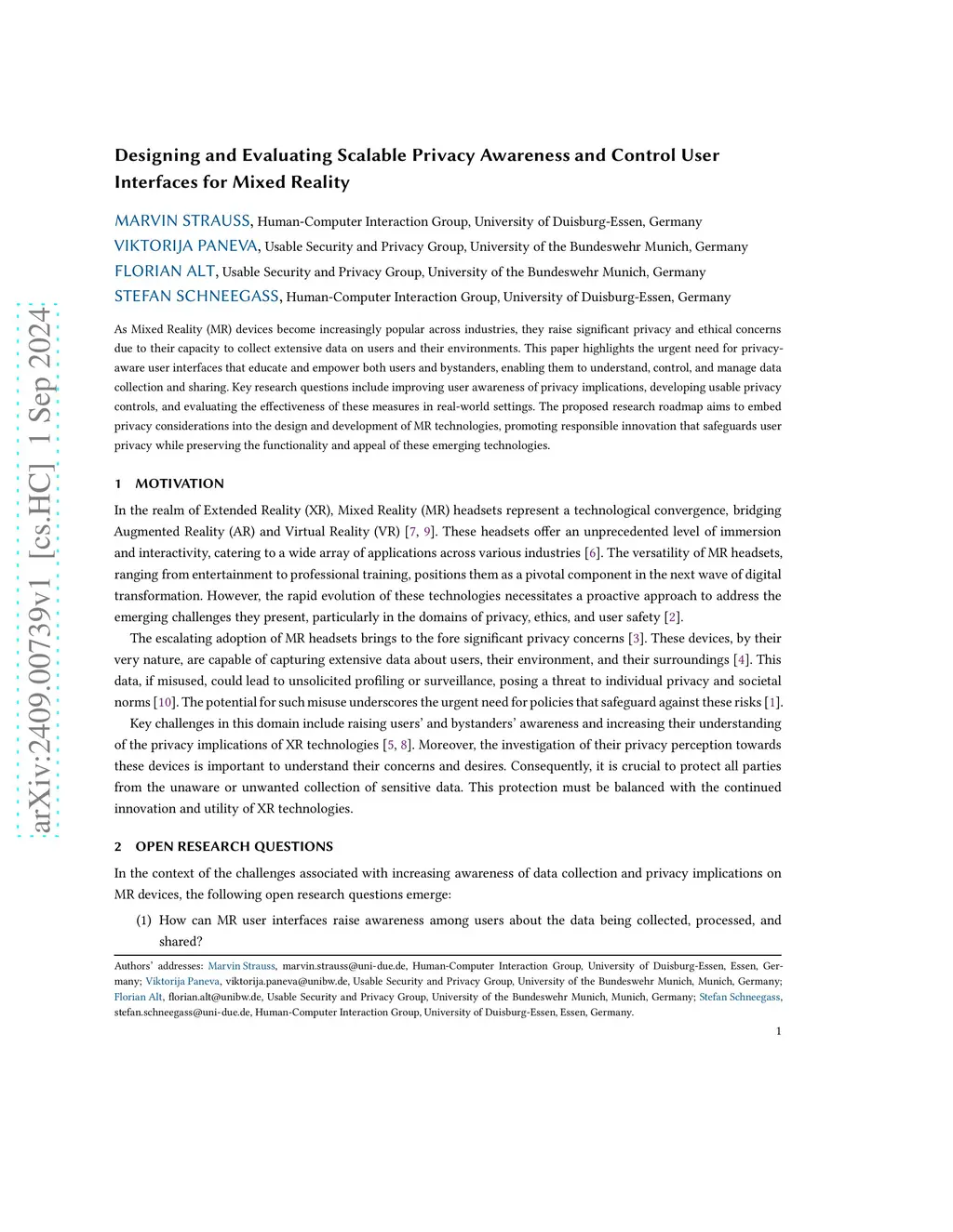 As Mixed Reality (MR) devices become increasingly popular across industries, they raise significant privacy and ethical concerns due to their capacity to collect extensive data on users and their environments. This paper highlights the urgent need for privacy-aware user interfaces that educate and empower both users and bystanders, enabling them to understand, control, and manage data collection and sharing. Key research questions include improving user awareness of privacy implications, developing usable privacy controls, and evaluating the effectiveness of these measures in real-world settings. The proposed research roadmap aims to embed privacy considerations into the design and development of MR technologies, promoting responsible innovation that safeguards user privacy while preserving the functionality and appeal of these emerging technologies.