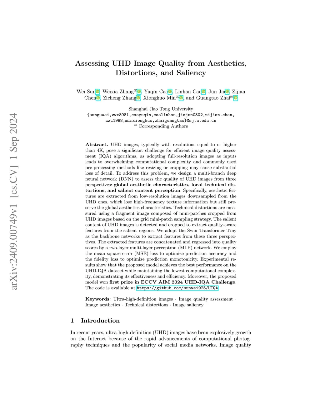 UHD images, typically with resolutions equal to or higher than 4K, pose a significant challenge for efficient image quality assessment (IQA) algorithms, as adopting full-resolution images as inputs leads to overwhelming computational complexity and commonly used pre-processing methods like resizing or cropping may cause substantial loss of detail. To address this problem, we design a multi-branch deep neural network (DNN) to assess the quality of UHD images from three perspectives: global aesthetic characteristics, local technical distortions, and salient content perception. Specifically, aesthetic features are extracted from low-resolution images downsampled from the UHD ones, which lose high-frequency texture information but still preserve the global aesthetics characteristics. Technical distortions are measured using a fragment image composed of mini-patches cropped from UHD images based on the grid mini-patch sampling strategy. The salient content of UHD images is detected and cropped to extract quality-aware features from the salient regions. We adopt the Swin Transformer Tiny as the backbone networks to extract features from these three perspectives. The extracted features are concatenated and regressed into quality scores by a two-layer multi-layer perceptron (MLP) network. We employ the mean square error (MSE) loss to optimize prediction accuracy and the fidelity loss to optimize prediction monotonicity. Experimental results show that the proposed model achieves the best performance on the UHD-IQA dataset while maintaining the lowest computational complexity, demonstrating its effectiveness and efficiency. Moreover, the proposed model won first prize in ECCV AIM 2024 UHD-IQA Challenge. The code is available at https://github.com/sunwei925/UIQA.