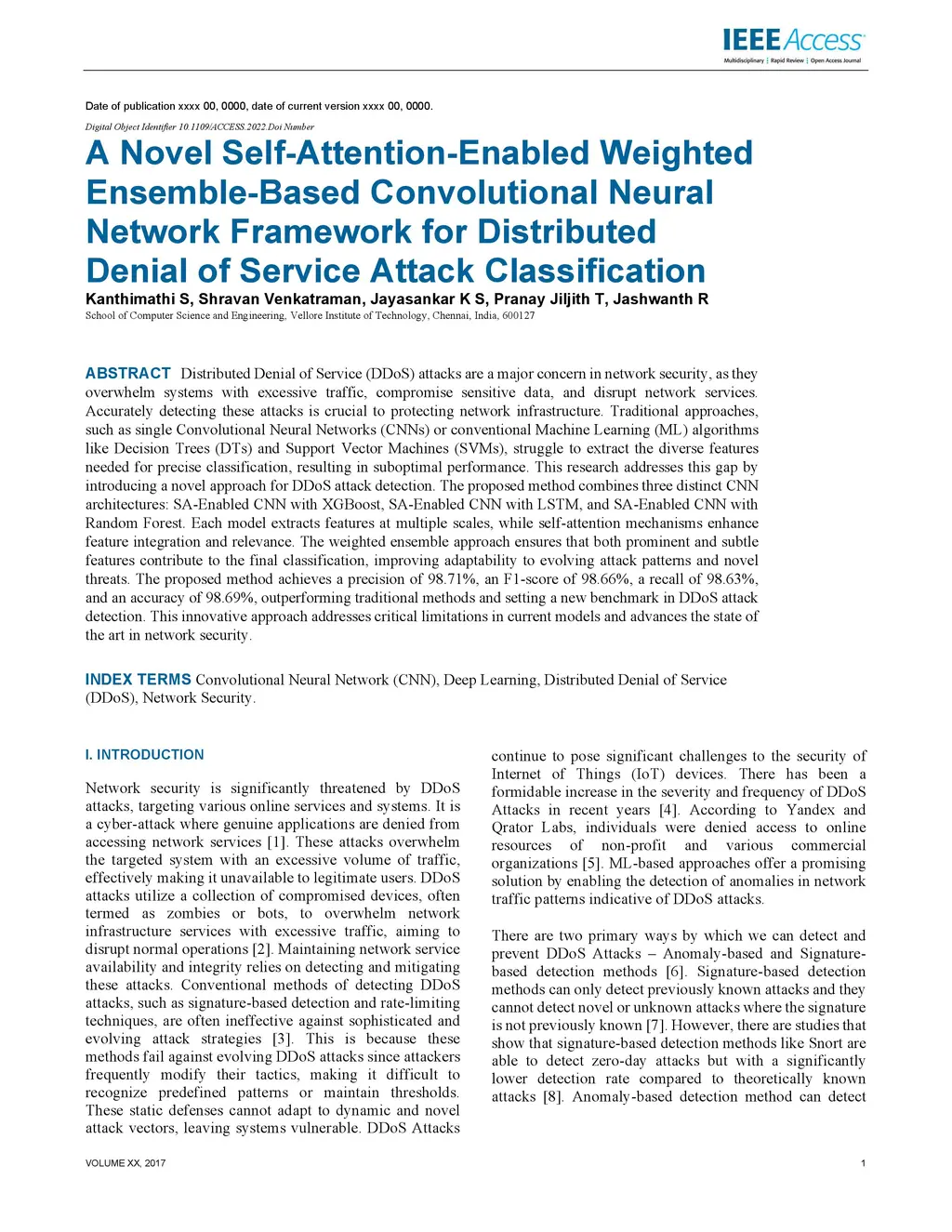Distributed Denial of Service (DDoS) attacks are a major concern in network security, as they overwhelm systems with excessive traffic, compromise sensitive data, and disrupt network services. Accurately detecting these attacks is crucial to protecting network infrastructure. Traditional approaches, such as single Convolutional Neural Networks (CNNs) or conventional Machine Learning (ML) algorithms like Decision Trees (DTs) and Support Vector Machines (SVMs), struggle to extract the diverse features needed for precise classification, resulting in suboptimal performance. This research addresses this gap by introducing a novel approach for DDoS attack detection. The proposed method combines three distinct CNN architectures: SA-Enabled CNN with XGBoost, SA-Enabled CNN with LSTM, and SA-Enabled CNN with Random Forest. Each model extracts features at multiple scales, while self-attention mechanisms enhance feature integration and relevance. The weighted ensemble approach ensures that both prominent and subtle features contribute to the final classification, improving adaptability to evolving attack patterns and novel threats. The proposed method achieves a precision of 98.71%, an F1-score of 98.66%, a recall of 98.63%, and an accuracy of 98.69%, outperforming traditional methods and setting a new benchmark in DDoS attack detection. This innovative approach addresses critical limitations in current models and advances the state of the art in network security.