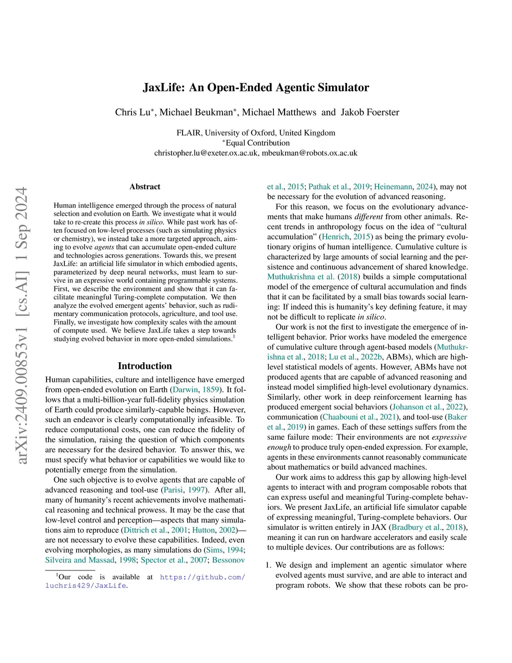 Human intelligence emerged through the process of natural selection and evolution on Earth. We investigate what it would take to re-create this process in silico. While past work has often focused on low-level processes (such as simulating physics or chemistry), we instead take a more targeted approach, aiming to evolve agents that can accumulate open-ended culture and technologies across generations. Towards this, we present JaxLife: an artificial life simulator in which embodied agents, parameterized by deep neural networks, must learn to survive in an expressive world containing programmable systems. First, we describe the environment and show that it can facilitate meaningful Turing-complete computation. We then analyze the evolved emergent agents' behavior, such as rudimentary communication protocols, agriculture, and tool use. Finally, we investigate how complexity scales with the amount of compute used. We believe JaxLife takes a step towards studying evolved behavior in more open-ended simulations. Our code is available at https://github.com/luchris429/JaxLife
