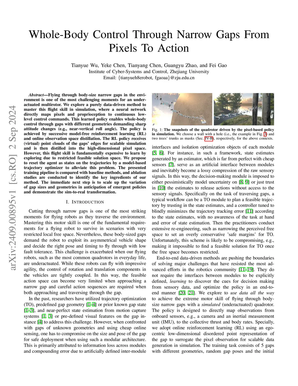 Flying through body-size narrow gaps in the environment is one of the most challenging moments for an underactuated multirotor. We explore a purely data-driven method to master this flight skill in simulation, where a neural network directly maps pixels and proprioception to continuous low-level control commands. This learned policy enables whole-body control through gaps with different geometries demanding sharp attitude changes (e.g., near-vertical roll angle). The policy is achieved by successive model-free reinforcement learning (RL) and online observation space distillation. The RL policy receives (virtual) point clouds of the gaps' edges for scalable simulation and is then distilled into the high-dimensional pixel space. However, this flight skill is fundamentally expensive to learn by exploring due to restricted feasible solution space. We propose to reset the agent as states on the trajectories by a model-based trajectory optimizer to alleviate this problem. The presented training pipeline is compared with baseline methods, and ablation studies are conducted to identify the key ingredients of our method. The immediate next step is to scale up the variation of gap sizes and geometries in anticipation of emergent policies and demonstrate the sim-to-real transformation.