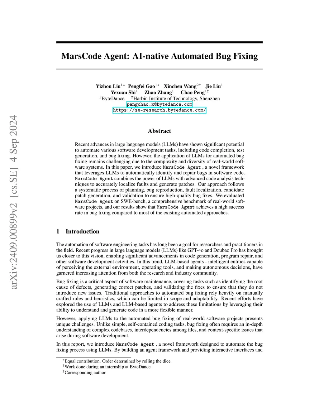 Recent advances in large language models (LLMs) have shown significant potential to automate various software development tasks, including code completion, test generation, and bug fixing. However, the application of LLMs for automated bug fixing remains challenging due to the complexity and diversity of real-world software systems. In this paper, we introduce MarsCode Agent, a novel framework that leverages LLMs to automatically identify and repair bugs in software code. MarsCode Agent combines the power of LLMs with advanced code analysis techniques to accurately localize faults and generate patches. Our approach follows a systematic process of planning, bug reproduction, fault localization, candidate patch generation, and validation to ensure high-quality bug fixes. We evaluated MarsCode Agent on SWE-bench, a comprehensive benchmark of real-world software projects, and our results show that MarsCode Agent achieves a high success rate in bug fixing compared to most of the existing automated approaches.