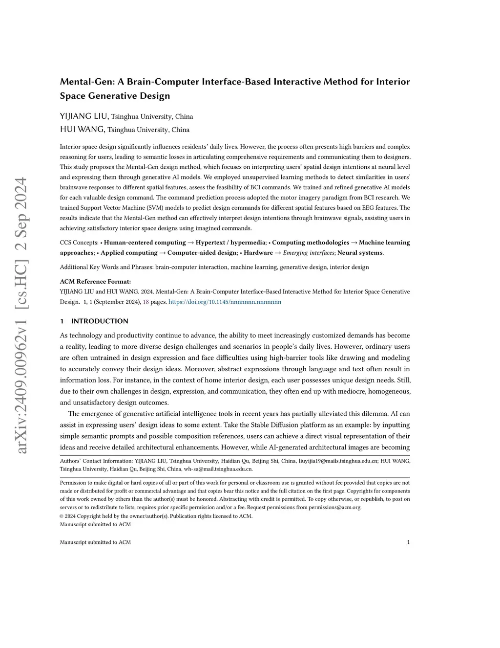 Interior space design significantly influences residents' daily lives. However, the process often presents high barriers and complex reasoning for users, leading to semantic losses in articulating comprehensive requirements and communicating them to designers. This study proposes the Mental-Gen design method, which focuses on interpreting users' spatial design intentions at neural level and expressing them through generative AI models. We employed unsupervised learning methods to detect similarities in users' brainwave responses to different spatial features, assess the feasibility of BCI commands. We trained and refined generative AI models for each valuable design command. The command prediction process adopted the motor imagery paradigm from BCI research. We trained Support Vector Machine (SVM) models to predict design commands for different spatial features based on EEG features. The results indicate that the Mental-Gen method can effectively interpret design intentions through brainwave signals, assisting users in achieving satisfactory interior space designs using imagined commands.