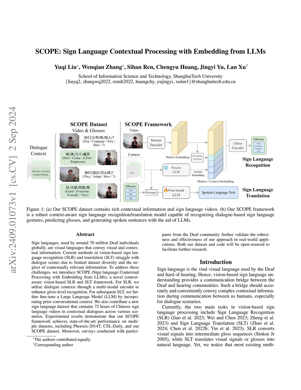 SCOPE: Sign Language Contextual Processing with Embedding from LLMs
