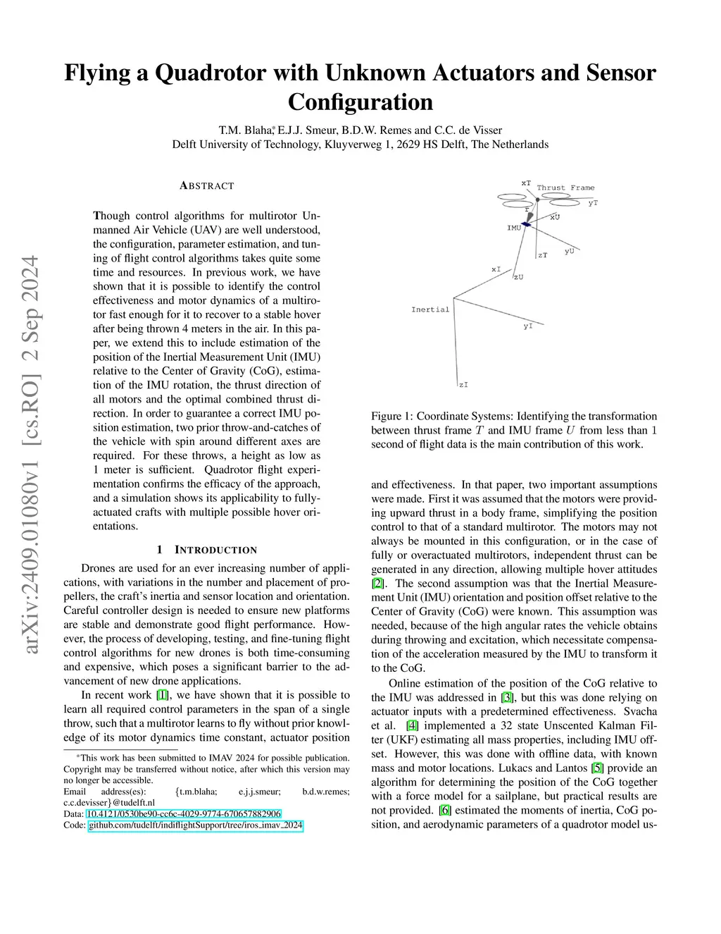 Though control algorithms for multirotor Unmanned Air Vehicle (UAV) are well understood, the configuration, parameter estimation, and tuning of flight control algorithms takes quite some time and resources. In previous work, we have shown that it is possible to identify the control effectiveness and motor dynamics of a multirotor fast enough for it to recover to a stable hover after being thrown 4 meters in the air. In this paper, we extend this to include estimation of the position of the Inertial Measurement Unit (IMU) relative to the Center of Gravity (CoG), estimation of the IMU rotation, the thrust direction of all motors and the optimal combined thrust direction. In order to guarantee a correct IMU position estimation, two prior throw-and-catches of the vehicle with spin around different axes are required. For these throws, a height as low as 1 meter is sufficient. Quadrotor flight experimentation confirms the efficacy of the approach, and a simulation shows its applicability to fully-actuated crafts with multiple possible hover orientations.