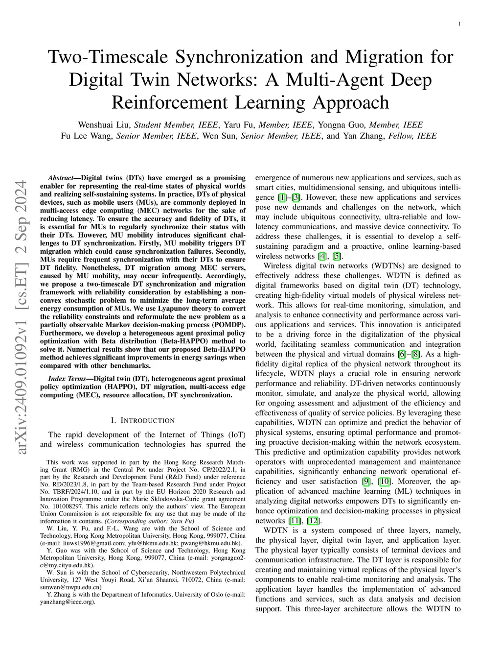 Digital twins (DTs) have emerged as a promising enabler for representing the real-time states of physical worlds and realizing self-sustaining systems. In practice, DTs of physical devices, such as mobile users (MUs), are commonly deployed in multi-access edge computing (MEC) networks for the sake of reducing latency. To ensure the accuracy and fidelity of DTs, it is essential for MUs to regularly synchronize their status with their DTs. However, MU mobility introduces significant challenges to DT synchronization. Firstly, MU mobility triggers DT migration which could cause synchronization failures. Secondly, MUs require frequent synchronization with their DTs to ensure DT fidelity. Nonetheless, DT migration among MEC servers, caused by MU mobility, may occur infrequently. Accordingly, we propose a two-timescale DT synchronization and migration framework with reliability consideration by establishing a non-convex stochastic problem to minimize the long-term average energy consumption of MUs. We use Lyapunov theory to convert the reliability constraints and reformulate the new problem as a partially observable Markov decision-making process (POMDP). Furthermore, we develop a heterogeneous agent proximal policy optimization with Beta distribution (Beta-HAPPO) method to solve it. Numerical results show that our proposed Beta-HAPPO method achieves significant improvements in energy savings when compared with other benchmarks.