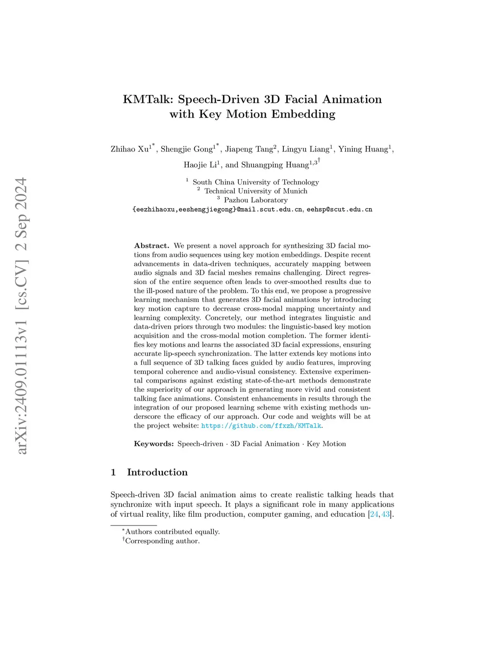 KMTalk: Speech-Driven 3D Facial Animation with Key Motion Embedding