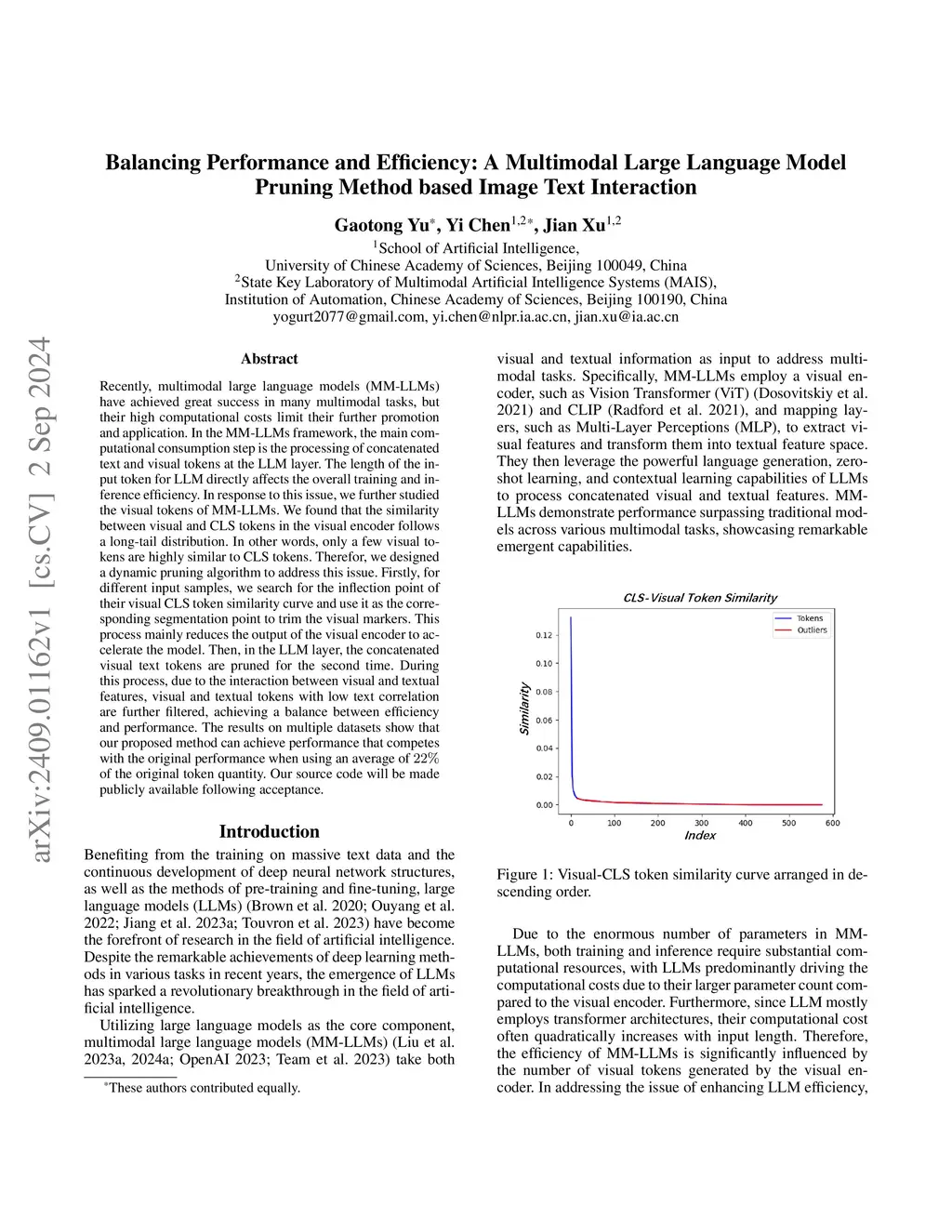 Recently, multimodal large language models (MM-LLMs) have achieved significant success in various tasks, but their high computational costs limit widespread application. The main computational burden arises from processing concatenated text and visual tokens in the LLM layer, where input token length directly affects efficiency. Our analysis of visual tokens reveals that their similarity to the CLS token follows a long-tail distribution, with only a few showing high similarity. To address this, we propose a dynamic pruning algorithm that identifies the inflection point in the visual CLS token similarity curve, enabling effective trimming of visual markers to accelerate model performance. Additionally, we perform a second round of pruning in the LLM layer, filtering out low-correlation tokens through the interaction between visual and textual features. Experimental results demonstrate that our method achieves performance comparable to the original while utilizing only 22% of the original token quantity. Our source code will be made publicly available upon acceptance.