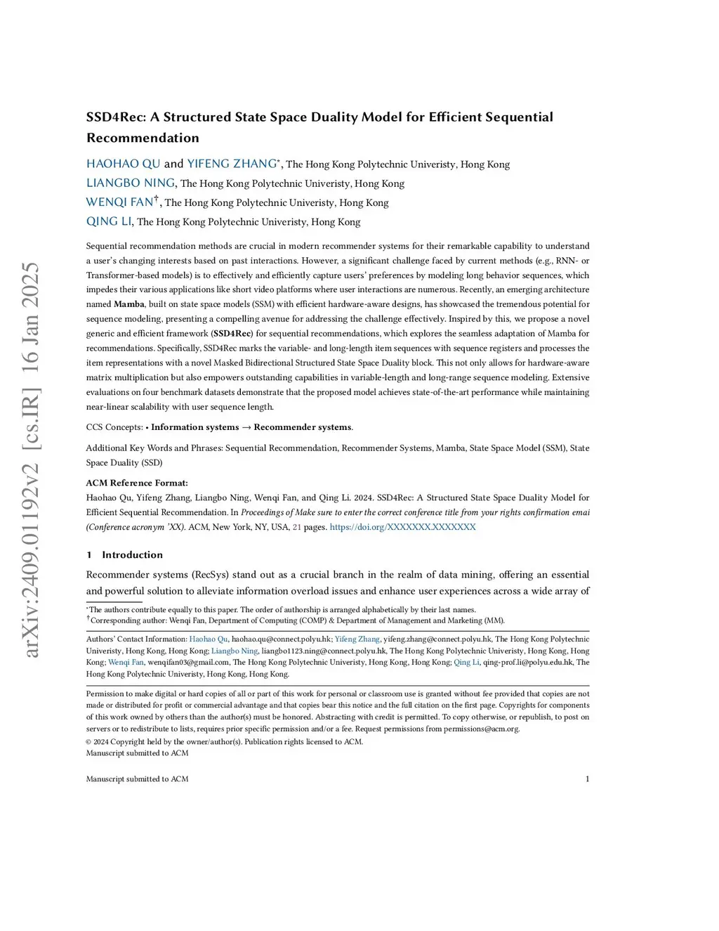 SSD4Rec: A Structured State Space Duality Model for Efficient Sequential Recommendation