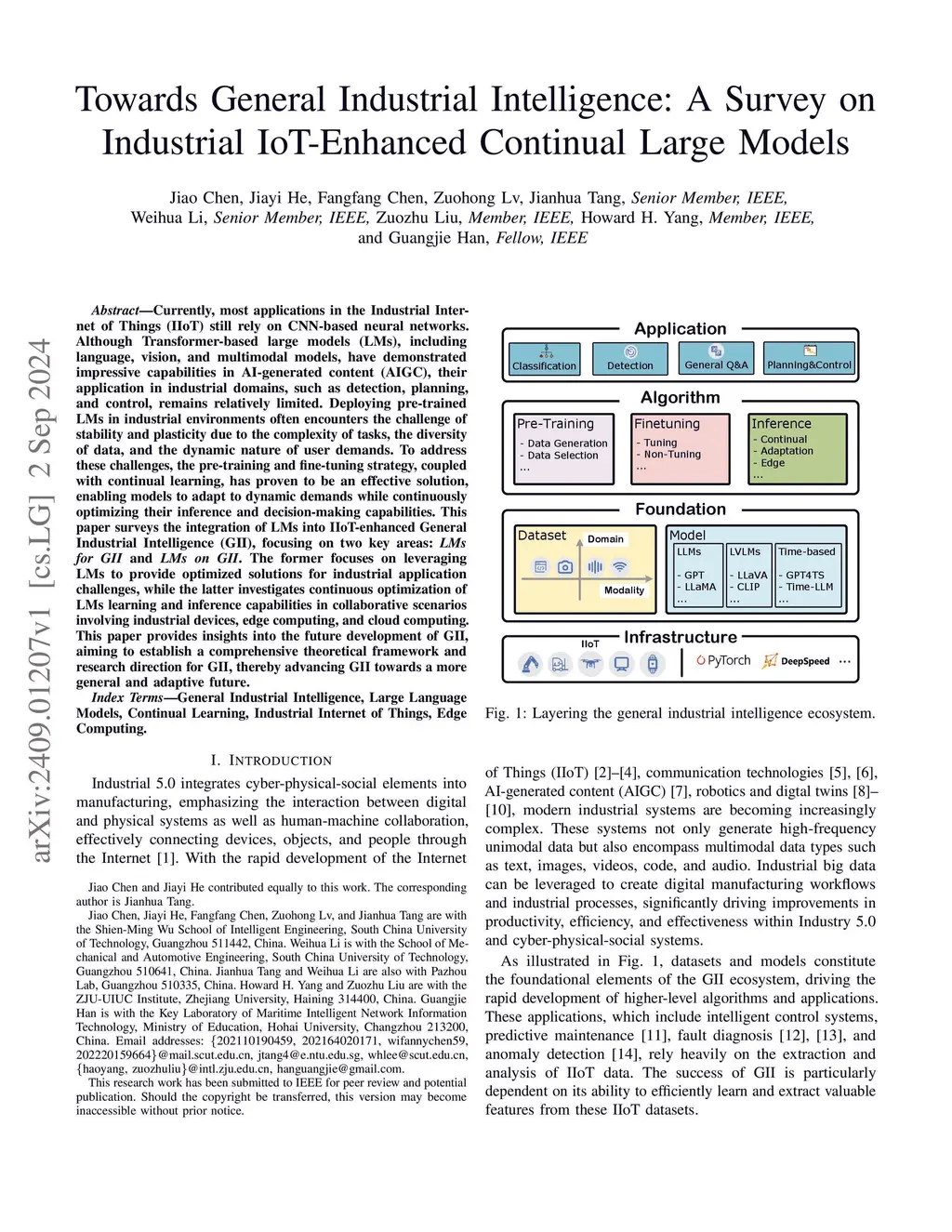 Currently, most applications in the Industrial Internet of Things (IIoT) still rely on CNN-based neural networks. Although Transformer-based large models (LMs), including language, vision, and multimodal models, have demonstrated impressive capabilities in AI-generated content (AIGC), their application in industrial domains, such as detection, planning, and control, remains relatively limited. Deploying pre-trained LMs in industrial environments often encounters the challenge of stability and plasticity due to the complexity of tasks, the diversity of data, and the dynamic nature of user demands. To address these challenges, the pre-training and fine-tuning strategy, coupled with continual learning, has proven to be an effective solution, enabling models to adapt to dynamic demands while continuously optimizing their inference and decision-making capabilities. This paper surveys the integration of LMs into IIoT-enhanced General Industrial Intelligence (GII), focusing on two key areas: LMs for GII and LMs on GII. The former focuses on leveraging LMs to provide optimized solutions for industrial application challenges, while the latter investigates continuous optimization of LMs learning and inference capabilities in collaborative scenarios involving industrial devices, edge computing, and cloud computing. This paper provides insights into the future development of GII, aiming to establish a comprehensive theoretical framework and research direction for GII, thereby advancing GII towards a more general and adaptive future.