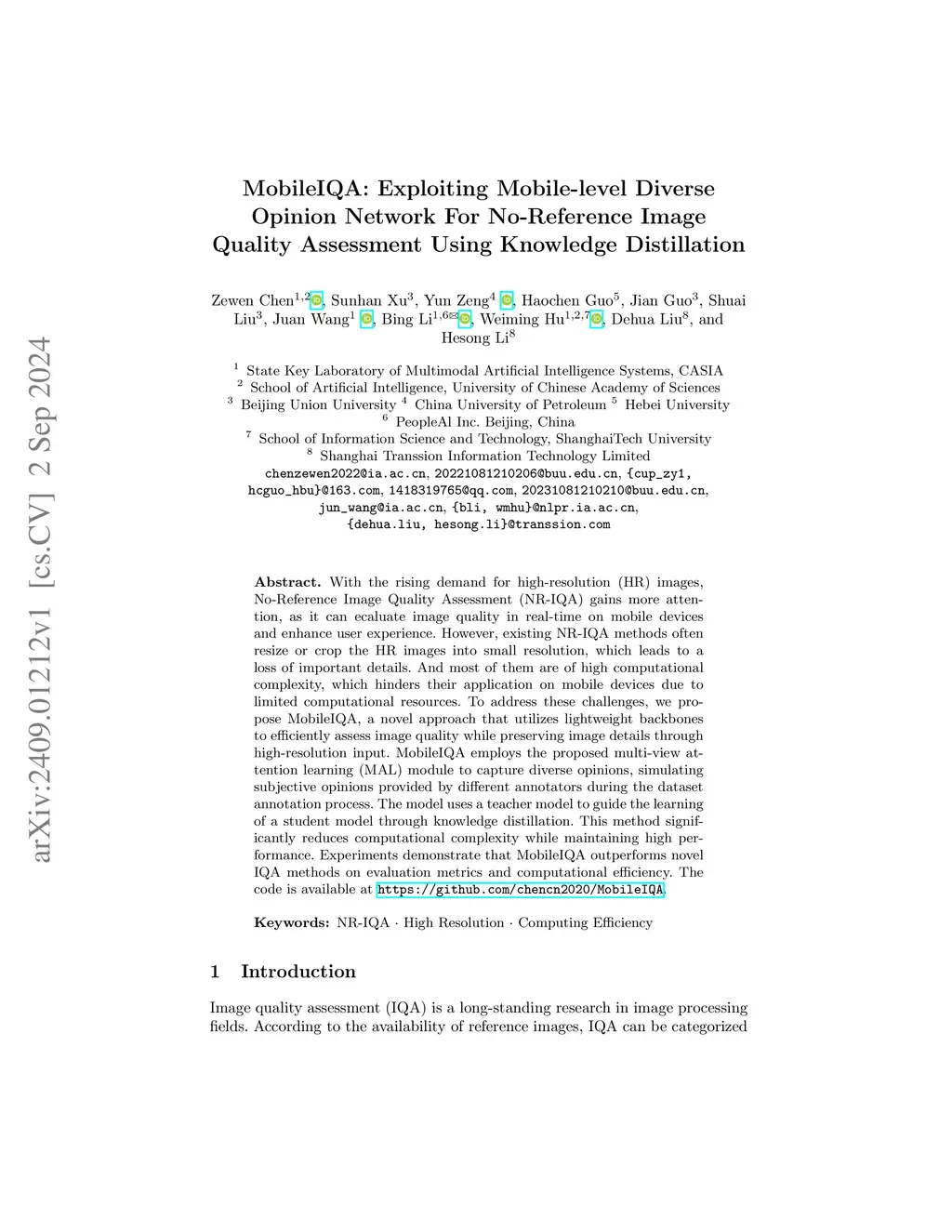 With the rising demand for high-resolution (HR) images, No-Reference Image Quality Assessment (NR-IQA) gains more attention, as it can ecaluate image quality in real-time on mobile devices and enhance user experience. However, existing NR-IQA methods often resize or crop the HR images into small resolution, which leads to a loss of important details. And most of them are of high computational complexity, which hinders their application on mobile devices due to limited computational resources. To address these challenges, we propose MobileIQA, a novel approach that utilizes lightweight backbones to efficiently assess image quality while preserving image details through high-resolution input. MobileIQA employs the proposed multi-view attention learning (MAL) module to capture diverse opinions, simulating subjective opinions provided by different annotators during the dataset annotation process. The model uses a teacher model to guide the learning of a student model through knowledge distillation. This method significantly reduces computational complexity while maintaining high performance. Experiments demonstrate that MobileIQA outperforms novel IQA methods on evaluation metrics and computational efficiency. The code is available at https://github.com/chencn2020/MobileIQA.