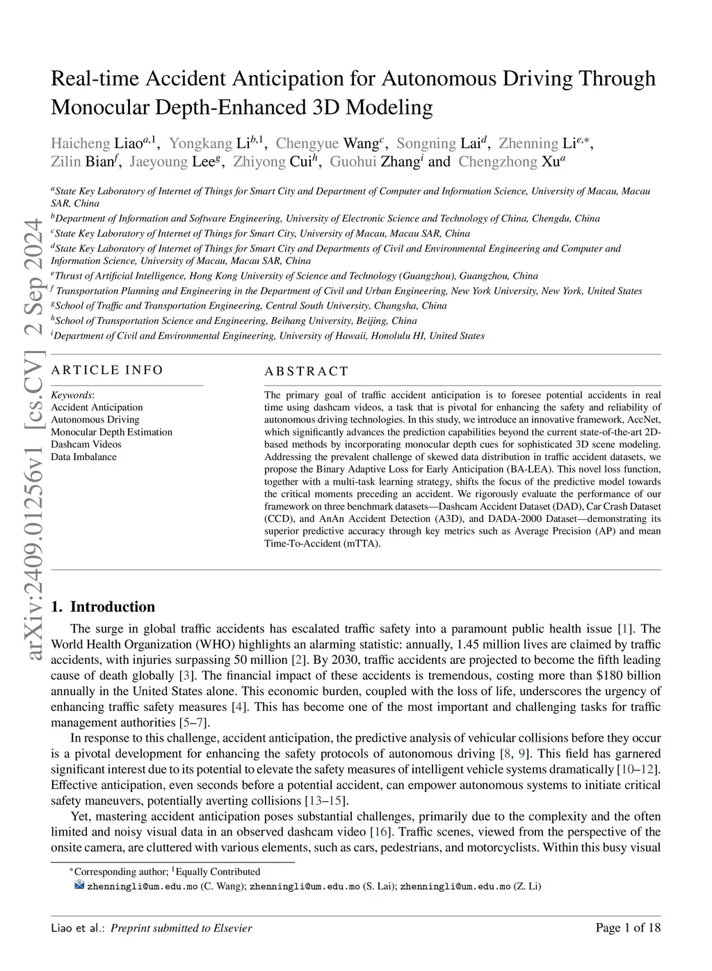 The primary goal of traffic accident anticipation is to foresee potential accidents in real time using dashcam videos, a task that is pivotal for enhancing the safety and reliability of autonomous driving technologies. In this study, we introduce an innovative framework, AccNet, which significantly advances the prediction capabilities beyond the current state-of-the-art (SOTA) 2D-based methods by incorporating monocular depth cues for sophisticated 3D scene modeling. Addressing the prevalent challenge of skewed data distribution in traffic accident datasets, we propose the Binary Adaptive Loss for Early Anticipation (BA-LEA). This novel loss function, together with a multi-task learning strategy, shifts the focus of the predictive model towards the critical moments preceding an accident. {We rigorously evaluate the performance of our framework on three benchmark datasets--Dashcam Accident Dataset (DAD), Car Crash Dataset (CCD), and AnAn Accident Detection (A3D), and DADA-2000 Dataset--demonstrating its superior predictive accuracy through key metrics such as Average Precision (AP) and mean Time-To-Accident (mTTA).
