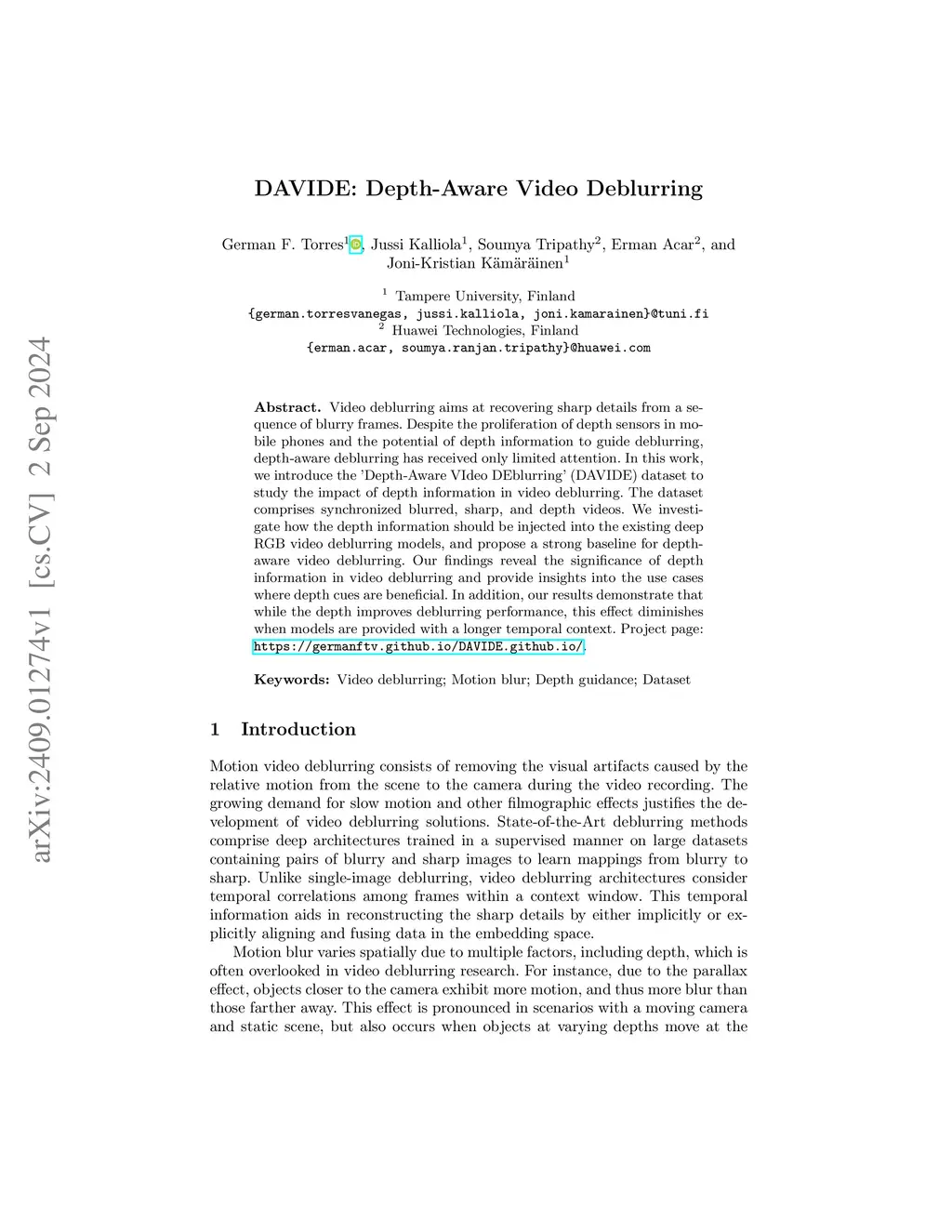 DAVIDE: Depth-Aware Video Deblurring