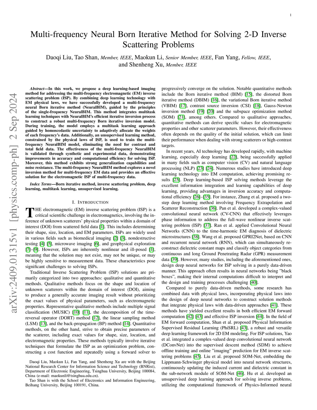 In this work, we propose a deep learning-based imaging method for addressing the multi-frequency electromagnetic (EM) inverse scattering problem (ISP). By combining deep learning technology with EM physical laws, we have successfully developed a multi-frequency neural Born iterative method (NeuralBIM), guided by the principles of the single-frequency NeuralBIM. This method integrates multitask learning techniques with NeuralBIM's efficient iterative inversion process to construct a robust multi-frequency Born iterative inversion model. During training, the model employs a multitask learning approach guided by homoscedastic uncertainty to adaptively allocate the weights of each frequency's data. Additionally, an unsupervised learning method, constrained by the physical laws of ISP, is used to train the multi-frequency NeuralBIM model, eliminating the need for contrast and total field data. The effectiveness of the multi-frequency NeuralBIM is validated through synthetic and experimental data, demonstrating improvements in accuracy and computational efficiency for solving ISP. Moreover, this method exhibits strong generalization capabilities and noise resistance. The multi-frequency NeuralBIM method explores a novel inversion method for multi-frequency EM data and provides an effective solution for the electromagnetic ISP of multi-frequency data.