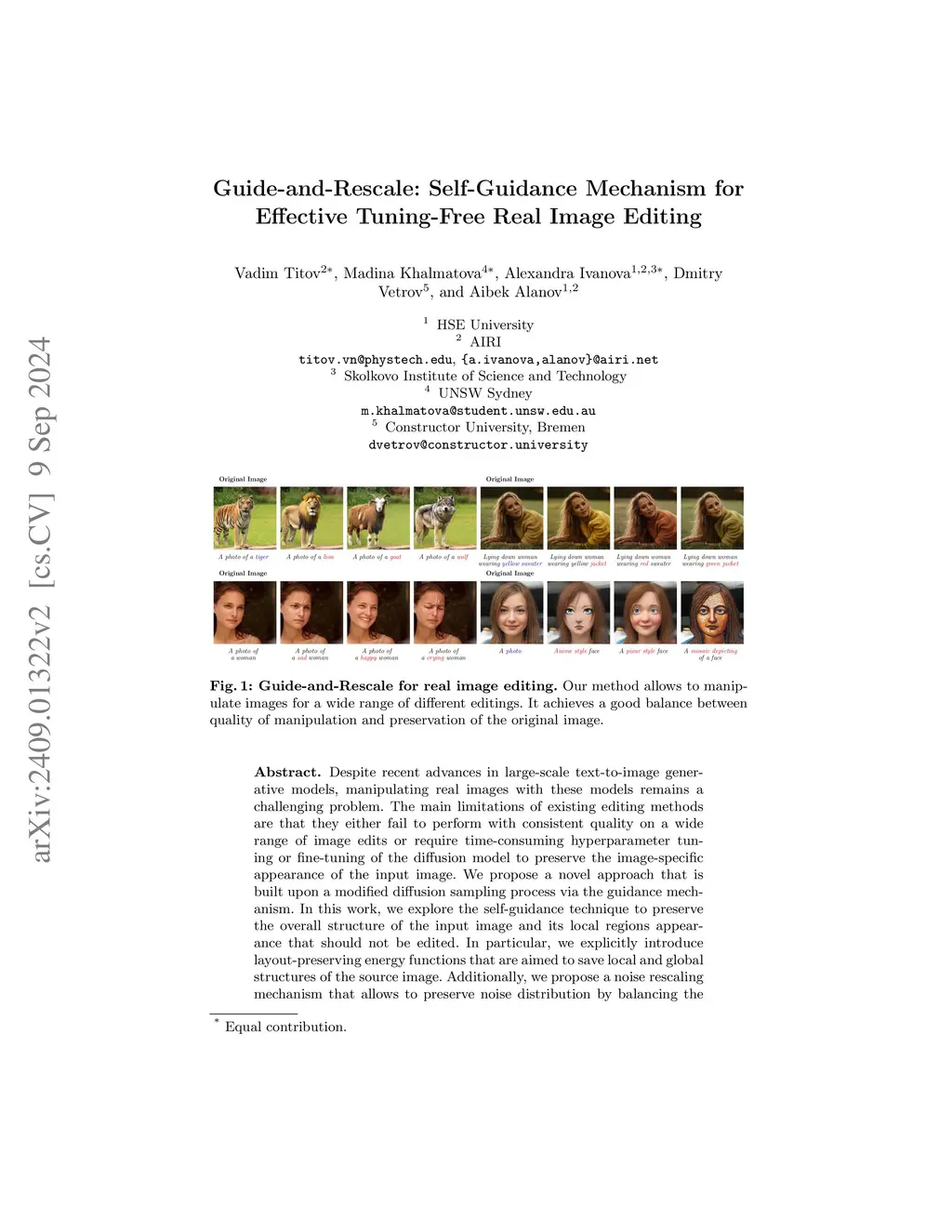 Despite recent advances in large-scale text-to-image generative models, manipulating real images with these models remains a challenging problem. The main limitations of existing editing methods are that they either fail to perform with consistent quality on a wide range of image edits or require time-consuming hyperparameter tuning or fine-tuning of the diffusion model to preserve the image-specific appearance of the input image. We propose a novel approach that is built upon a modified diffusion sampling process via the guidance mechanism. In this work, we explore the self-guidance technique to preserve the overall structure of the input image and its local regions appearance that should not be edited. In particular, we explicitly introduce layout-preserving energy functions that are aimed to save local and global structures of the source image. Additionally, we propose a noise rescaling mechanism that allows to preserve noise distribution by balancing the norms of classifier-free guidance and our proposed guiders during generation. Such a guiding approach does not require fine-tuning the diffusion model and exact inversion process. As a result, the proposed method provides a fast and high-quality editing mechanism. In our experiments, we show through human evaluation and quantitative analysis that the proposed method allows to produce desired editing which is more preferable by humans and also achieves a better trade-off between editing quality and preservation of the original image. Our code is available at https://github.com/MACderRu/Guide-and-Rescale.