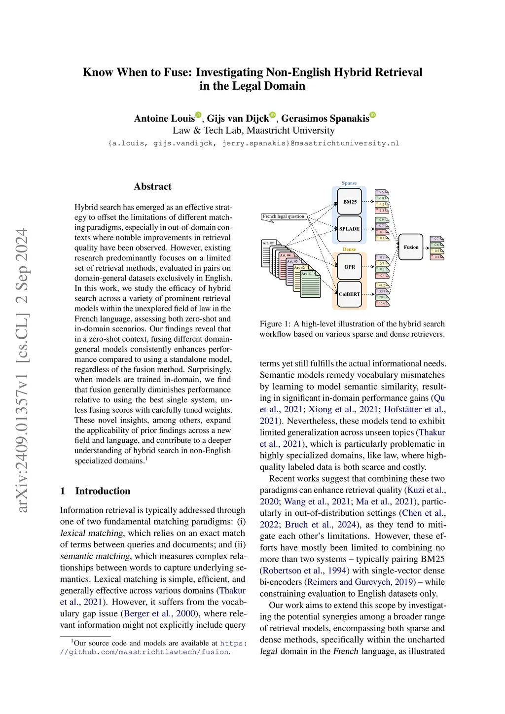 Hybrid search has emerged as an effective strategy to offset the limitations of different matching paradigms, especially in out-of-domain contexts where notable improvements in retrieval quality have been observed. However, existing research predominantly focuses on a limited set of retrieval methods, evaluated in pairs on domain-general datasets exclusively in English. In this work, we study the efficacy of hybrid search across a variety of prominent retrieval models within the unexplored field of law in the French language, assessing both zero-shot and in-domain scenarios. Our findings reveal that in a zero-shot context, fusing different domain-general models consistently enhances performance compared to using a standalone model, regardless of the fusion method. Surprisingly, when models are trained in-domain, we find that fusion generally diminishes performance relative to using the best single system, unless fusing scores with carefully tuned weights. These novel insights, among others, expand the applicability of prior findings across a new field and language, and contribute to a deeper understanding of hybrid search in non-English specialized domains.