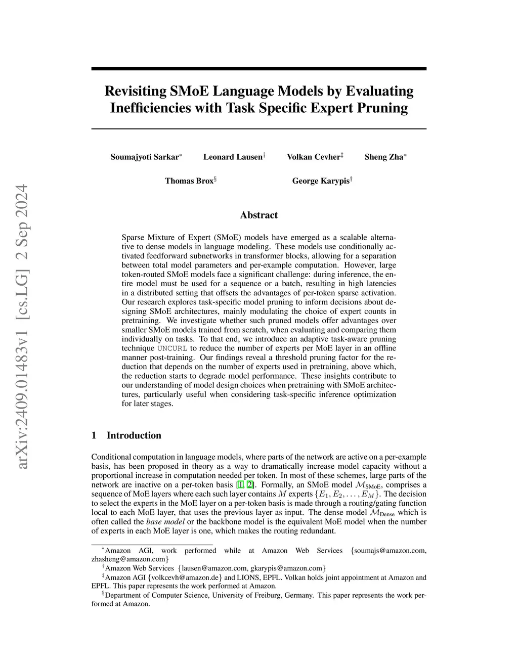 Sparse Mixture of Expert (SMoE) models have emerged as a scalable alternative to dense models in language modeling. These models use conditionally activated feedforward subnetworks in transformer blocks, allowing for a separation between total model parameters and per-example computation. However, large token-routed SMoE models face a significant challenge: during inference, the entire model must be used for a sequence or a batch, resulting in high latencies in a distributed setting that offsets the advantages of per-token sparse activation. Our research explores task-specific model pruning to inform decisions about designing SMoE architectures, mainly modulating the choice of expert counts in pretraining. We investigate whether such pruned models offer advantages over smaller SMoE models trained from scratch, when evaluating and comparing them individually on tasks. To that end, we introduce an adaptive task-aware pruning technique UNCURL to reduce the number of experts per MoE layer in an offline manner post-training. Our findings reveal a threshold pruning factor for the reduction that depends on the number of experts used in pretraining, above which, the reduction starts to degrade model performance. These insights contribute to our understanding of model design choices when pretraining with SMoE architectures, particularly useful when considering task-specific inference optimization for later stages.