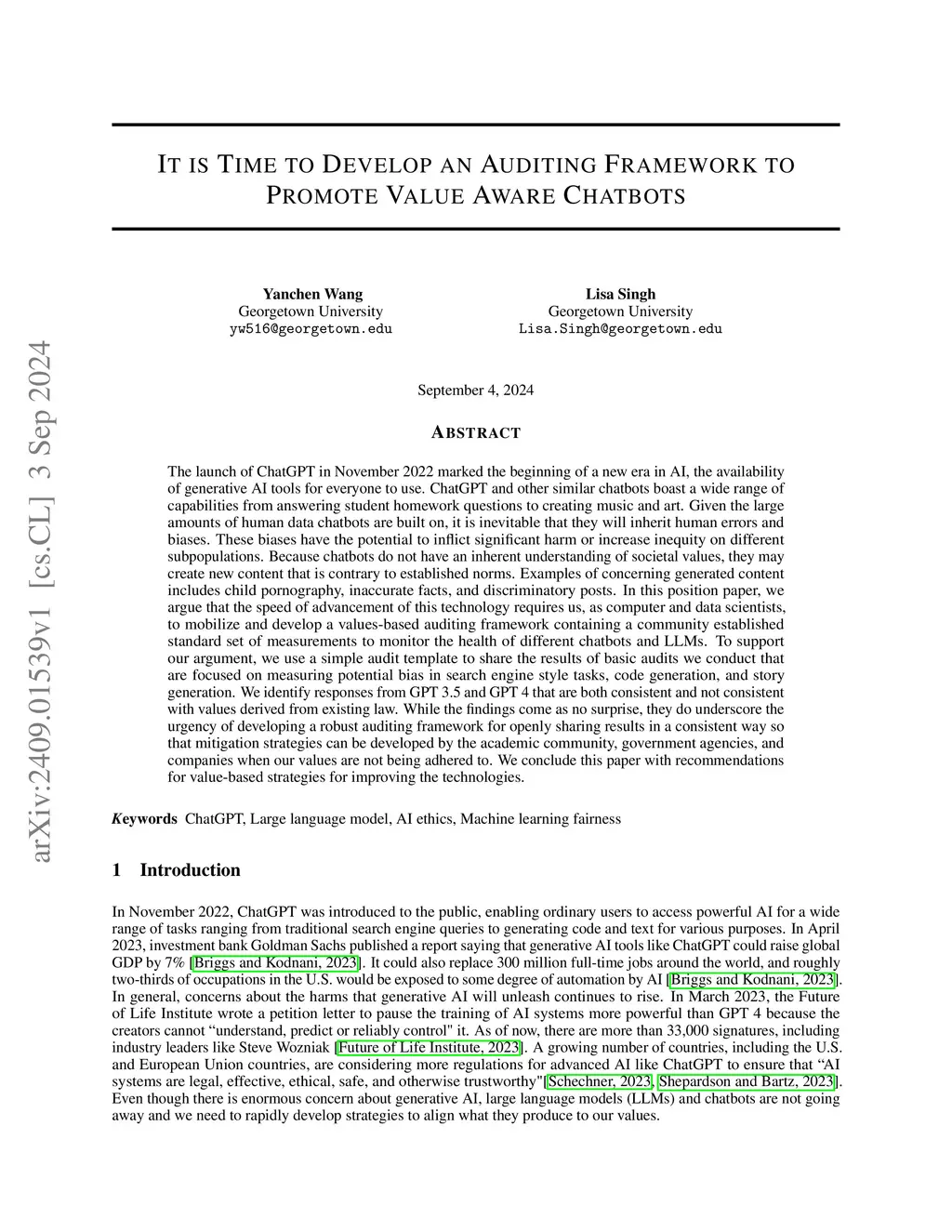 The launch of ChatGPT in November 2022 marked the beginning of a new era in AI, the availability of generative AI tools for everyone to use. ChatGPT and other similar chatbots boast a wide range of capabilities from answering student homework questions to creating music and art. Given the large amounts of human data chatbots are built on, it is inevitable that they will inherit human errors and biases. These biases have the potential to inflict significant harm or increase inequity on different subpopulations. Because chatbots do not have an inherent understanding of societal values, they may create new content that is contrary to established norms. Examples of concerning generated content includes child pornography, inaccurate facts, and discriminatory posts. In this position paper, we argue that the speed of advancement of this technology requires us, as computer and data scientists, to mobilize and develop a values-based auditing framework containing a community established standard set of measurements to monitor the health of different chatbots and LLMs. To support our argument, we use a simple audit template to share the results of basic audits we conduct that are focused on measuring potential bias in search engine style tasks, code generation, and story generation. We identify responses from GPT 3.5 and GPT 4 that are both consistent and not consistent with values derived from existing law. While the findings come as no surprise, they do underscore the urgency of developing a robust auditing framework for openly sharing results in a consistent way so that mitigation strategies can be developed by the academic community, government agencies, and companies when our values are not being adhered to. We conclude this paper with recommendations for value-based strategies for improving the technologies.