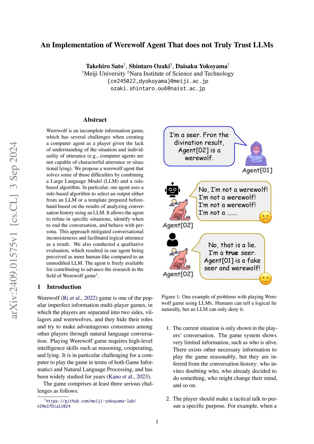 An Implementation of Werewolf Agent That does not Truly Trust LLMs