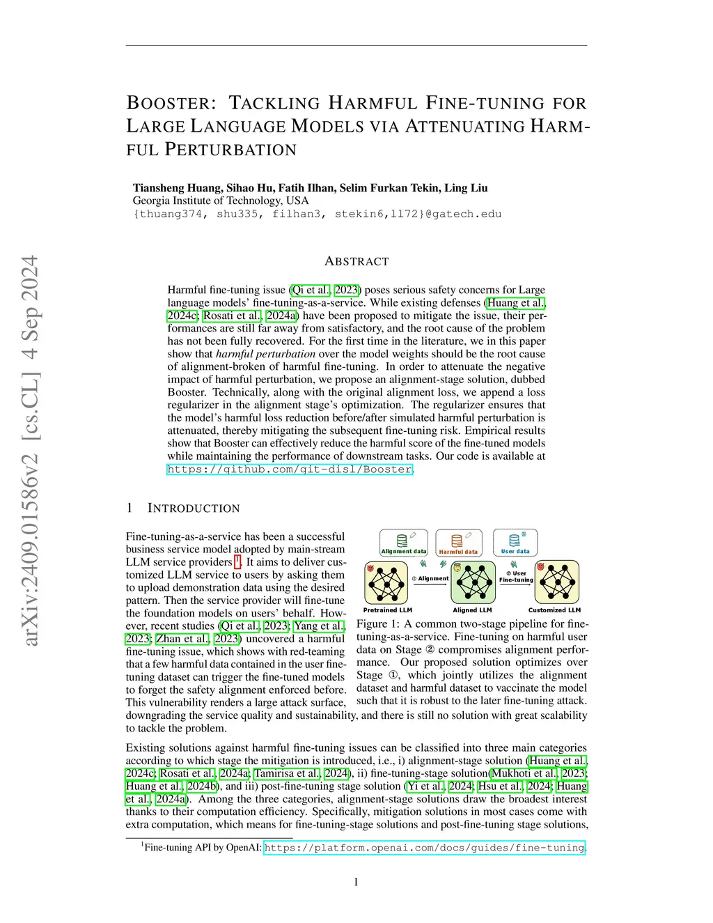 Harmful fine-tuning attack poses serious safety concerns for large language models' fine-tuning-as-a-service. While existing defenses have been proposed to mitigate the issue, their performances are still far away from satisfactory, and the root cause of the problem has not been fully recovered. To this end, we in this paper show that harmful perturbation over the model weights could be a probable cause of alignment-broken. In order to attenuate the negative impact of harmful perturbation, we propose an alignment-stage solution, dubbed Booster. Technically, along with the original alignment loss, we append a loss regularizer in the alignment stage's optimization. The regularizer ensures that the model's harmful loss reduction after the simulated harmful perturbation is attenuated, thereby mitigating the subsequent fine-tuning risk. Empirical results show that Booster can effectively reduce the harmful score of the fine-tuned models while maintaining the performance of downstream tasks. Our code is available atthis https URL.