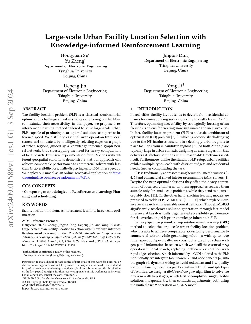 The facility location problem (FLP) is a classical combinatorial optimization challenge aimed at strategically laying out facilities to maximize their accessibility. In this paper, we propose a reinforcement learning method tailored to solve large-scale urban FLP, capable of producing near-optimal solutions at superfast inference speed. We distill the essential swap operation from local search, and simulate it by intelligently selecting edges on a graph of urban regions, guided by a knowledge-informed graph neural network, thus sidestepping the need for heavy computation of local search. Extensive experiments on four US cities with different geospatial conditions demonstrate that our approach can achieve comparable performance to commercial solvers with less than 5\% accessibility loss, while displaying up to 1000 times speedup. We deploy our model as an online geospatial application at https://huggingface.co/spaces/randommmm/MFLP.