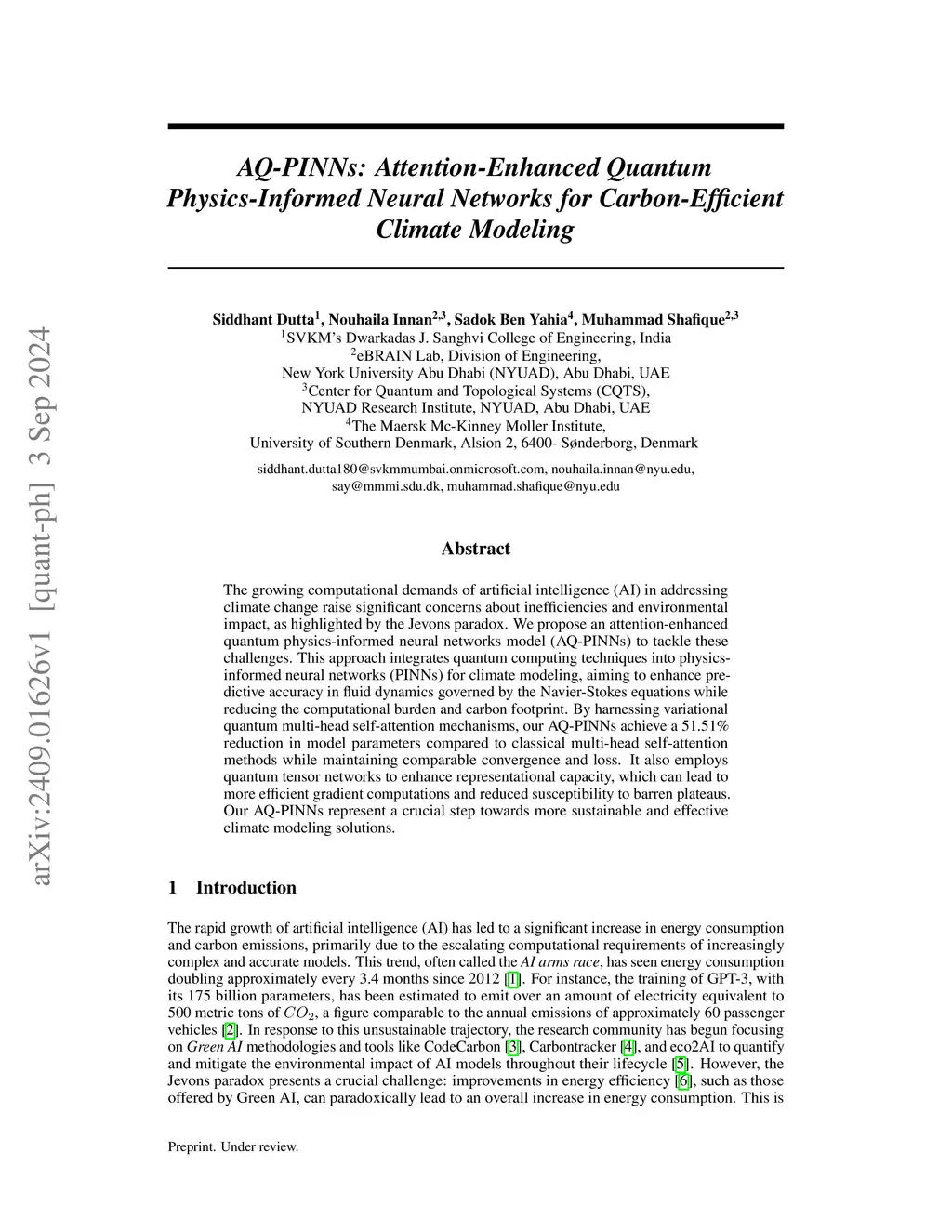The growing computational demands of artificial intelligence (AI) in addressing climate change raise significant concerns about inefficiencies and environmental impact, as highlighted by the Jevons paradox. We propose an attention-enhanced quantum physics-informed neural networks model (AQ-PINNs) to tackle these challenges. This approach integrates quantum computing techniques into physics-informed neural networks (PINNs) for climate modeling, aiming to enhance predictive accuracy in fluid dynamics governed by the Navier-Stokes equations while reducing the computational burden and carbon footprint. By harnessing variational quantum multi-head self-attention mechanisms, our AQ-PINNs achieve a 51.51% reduction in model parameters compared to classical multi-head self-attention methods while maintaining comparable convergence and loss. It also employs quantum tensor networks to enhance representational capacity, which can lead to more efficient gradient computations and reduced susceptibility to barren plateaus. Our AQ-PINNs represent a crucial step towards more sustainable and effective climate modeling solutions.
