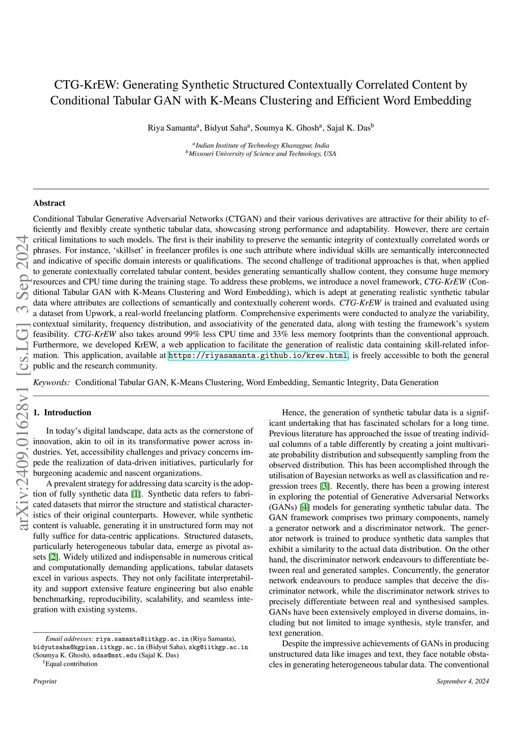 Conditional Tabular Generative Adversarial Networks (CTGAN) and their various derivatives are attractive for their ability to efficiently and flexibly create synthetic tabular data, showcasing strong performance and adaptability. However, there are certain critical limitations to such models. The first is their inability to preserve the semantic integrity of contextually correlated words or phrases. For instance, skillset in freelancer profiles is one such attribute where individual skills are semantically interconnected and indicative of specific domain interests or qualifications. The second challenge of traditional approaches is that, when applied to generate contextually correlated tabular content, besides generating semantically shallow content, they consume huge memory resources and CPU time during the training stage. To address these problems, we introduce a novel framework, CTGKrEW (Conditional Tabular GAN with KMeans Clustering and Word Embedding), which is adept at generating realistic synthetic tabular data where attributes are collections of semantically and contextually coherent words. CTGKrEW is trained and evaluated using a dataset from Upwork, a realworld freelancing platform. Comprehensive experiments were conducted to analyze the variability, contextual similarity, frequency distribution, and associativity of the generated data, along with testing the framework's system feasibility. CTGKrEW also takes around 99\% less CPU time and 33\% less memory footprints than the conventional approach. Furthermore, we developed KrEW, a web application to facilitate the generation of realistic data containing skill-related information. This application, available at https://riyasamanta.github.io/krew.html, is freely accessible to both the general public and the research community.