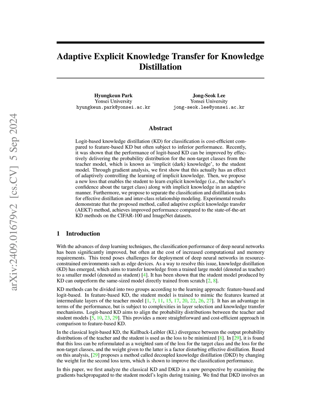 Adaptive Explicit Knowledge Transfer for Knowledge Distillation