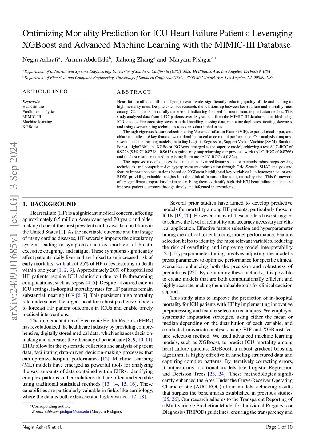 Heart failure affects millions of people worldwide, significantly reducing quality of life and leading to high mortality rates. Despite extensive research, the relationship between heart failure and mortality rates among ICU patients is not fully understood, indicating the need for more accurate prediction models. This study analyzed data from 1,177 patients over 18 years old from the MIMIC-III database, identified using ICD-9 codes. Preprocessing steps included handling missing data, removing duplicates, treating skewness, and using oversampling techniques to address data imbalances. Through rigorous feature selection using Variance Inflation Factor (VIF), expert clinical input, and ablation studies, 46 key features were identified to enhance model performance. Our analysis compared several machine learning models, including Logistic Regression, Support Vector Machine (SVM), Random Forest, LightGBM, and XGBoost. XGBoost emerged as the superior model, achieving a test AUC-ROC of 0.9228 (95\% CI 0.8748 - 0.9613), significantly outperforming our previous work (AUC-ROC of 0.8766) and the best results reported in existing literature (AUC-ROC of 0.824). The improved model's success is attributed to advanced feature selection methods, robust preprocessing techniques, and comprehensive hyperparameter optimization through Grid-Search. SHAP analysis and feature importance evaluations based on XGBoost highlighted key variables like leucocyte count and RDW, providing valuable insights into the clinical factors influencing mortality risk. This framework offers significant support for clinicians, enabling them to identify high-risk ICU heart failure patients and improve patient outcomes through timely and informed interventions.