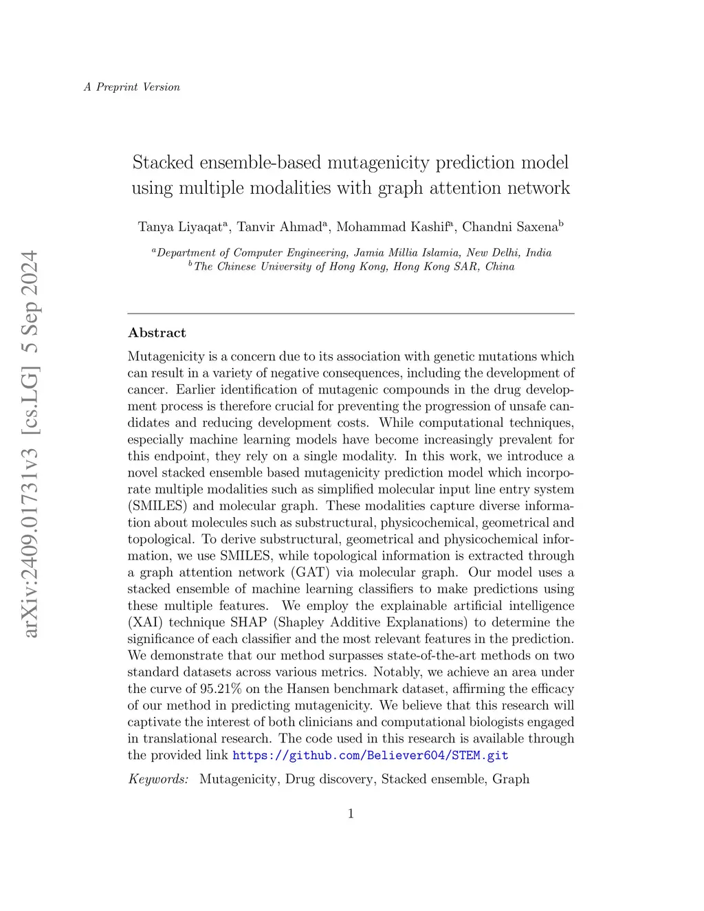 Mutagenicity is a concern due to its association with genetic mutations which can result in a variety of negative consequences, including the development of cancer. Earlier identification of mutagenic compounds in the drug development process is therefore crucial for preventing the progression of unsafe candidates and reducing development costs. While computational techniques, especially machine learning models have become increasingly prevalent for this endpoint, they rely on a single modality. In this work, we introduce a novel stacked ensemble based mutagenicity prediction model which incorporate multiple modalities such as simplified molecular input line entry system (SMILES) and molecular graph. These modalities capture diverse information about molecules such as substructural, physicochemical, geometrical and topological. To derive substructural, geometrical and physicochemical information, we use SMILES, while topological information is extracted through a graph attention network (GAT) via molecular graph. Our model uses a stacked ensemble of machine learning classifiers to make predictions using these multiple features. We employ the explainable artificial intelligence (XAI) technique SHAP (Shapley Additive Explanations) to determine the significance of each classifier and the most relevant features in the prediction. We demonstrate that our method surpasses SOTA methods on two standard datasets across various metrics. Notably, we achieve an area under the curve of 95.21\% on the Hansen benchmark dataset, affirming the efficacy of our method in predicting mutagenicity. We believe that this research will captivate the interest of both clinicians and computational biologists engaged in translational research.