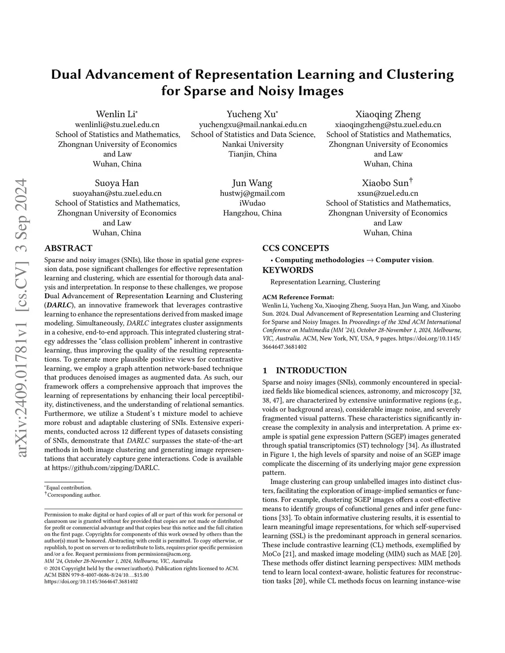 Sparse and noisy images (SNIs), like those in spatial gene expression data, pose significant challenges for effective representation learning and clustering, which are essential for thorough data analysis and interpretation. In response to these challenges, we propose Dual Advancement of Representation Learning and Clustering (DARLC), an innovative framework that leverages contrastive learning to enhance the representations derived from masked image modeling. Simultaneously, DARLC integrates cluster assignments in a cohesive, end-to-end approach. This integrated clustering strategy addresses the "class collision problem" inherent in contrastive learning, thus improving the quality of the resulting representations. To generate more plausible positive views for contrastive learning, we employ a graph attention network-based technique that produces denoised images as augmented data. As such, our framework offers a comprehensive approach that improves the learning of representations by enhancing their local perceptibility, distinctiveness, and the understanding of relational semantics. Furthermore, we utilize a Student's t mixture model to achieve more robust and adaptable clustering of SNIs. Extensive experiments, conducted across 12 different types of datasets consisting of SNIs, demonstrate that DARLC surpasses the state-of-the-art methods in both image clustering and generating image representations that accurately capture gene interactions. Code is available at https://github.com/zipging/DARLC.
