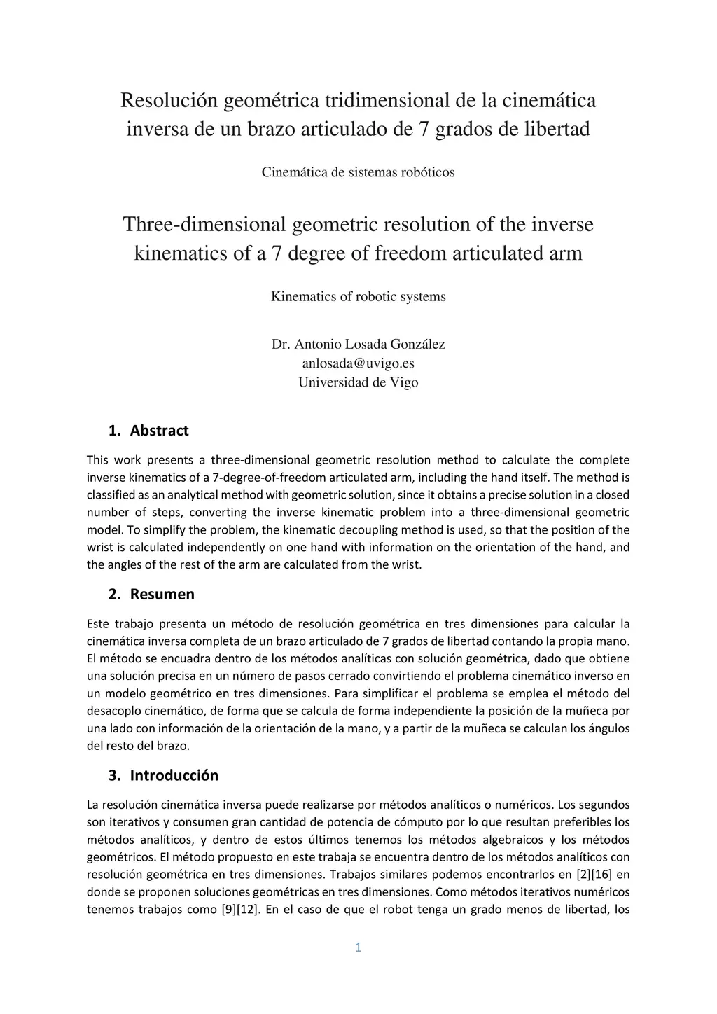 This work presents a three-dimensional geometric resolution method to calculate the complete inverse kinematics of a 7-degree-of-freedom articulated arm, including the hand itself. The method is classified as an analytical method with geometric solution, since it obtains a precise solution in a closed number of steps, converting the inverse kinematic problem into a three-dimensional geometric model. To simplify the problem, the kinematic decoupling method is used, so that the position of the wrist is calculated independently on one hand with information on the orientation of the hand, and the angles of the rest of the arm are calculated from the wrist.