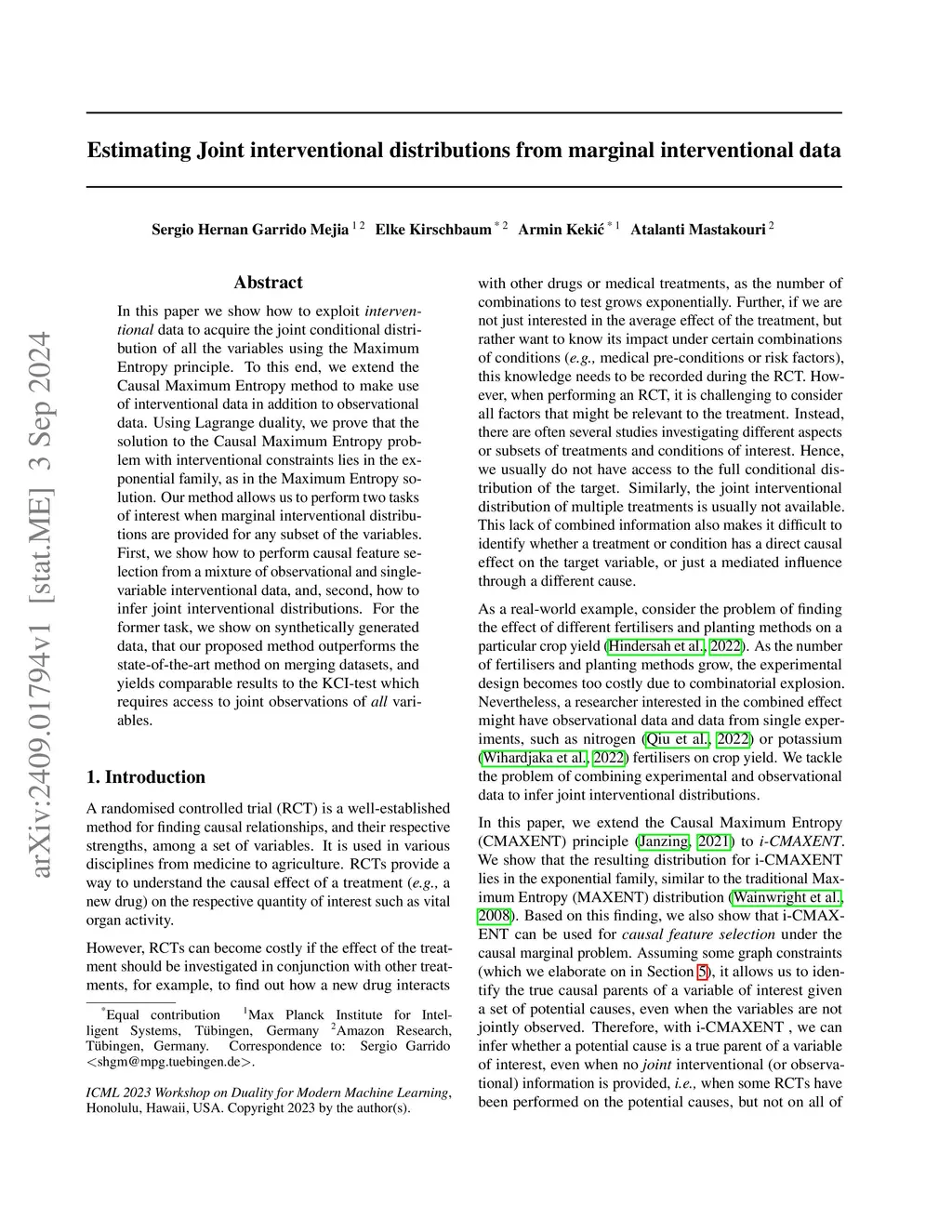 In this paper we show how to exploit interventional data to acquire the joint conditional distribution of all the variables using the Maximum Entropy principle. To this end, we extend the Causal Maximum Entropy method to make use of interventional data in addition to observational data. Using Lagrange duality, we prove that the solution to the Causal Maximum Entropy problem with interventional constraints lies in the exponential family, as in the Maximum Entropy solution. Our method allows us to perform two tasks of interest when marginal interventional distributions are provided for any subset of the variables. First, we show how to perform causal feature selection from a mixture of observational and single-variable interventional data, and, second, how to infer joint interventional distributions. For the former task, we show on synthetically generated data, that our proposed method outperforms the state-of-the-art method on merging datasets, and yields comparable results to the KCI-test which requires access to joint observations of all variables.
